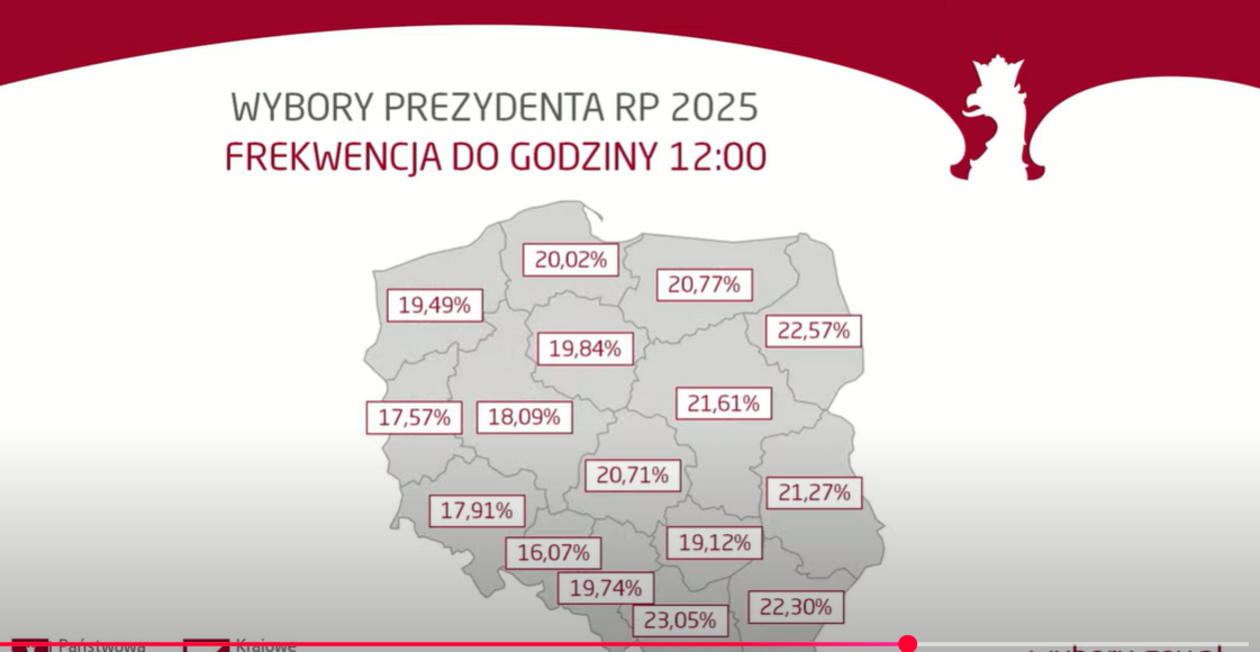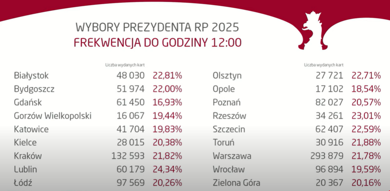 Podczas konferencji podano ogólnopolską frekwencję w wyborach na godzinę 12. Według danych ze 100 proc. obwodowych komisji wyborczych do urn poszło 20,28 proc. uprawnionych do głosowania. To o blisko 5 proc. więcej niż w wyborach w 2015 roku, a o ok. 1,8 proc. mniej niż w wyborach prezydenckich w 2020 roku.