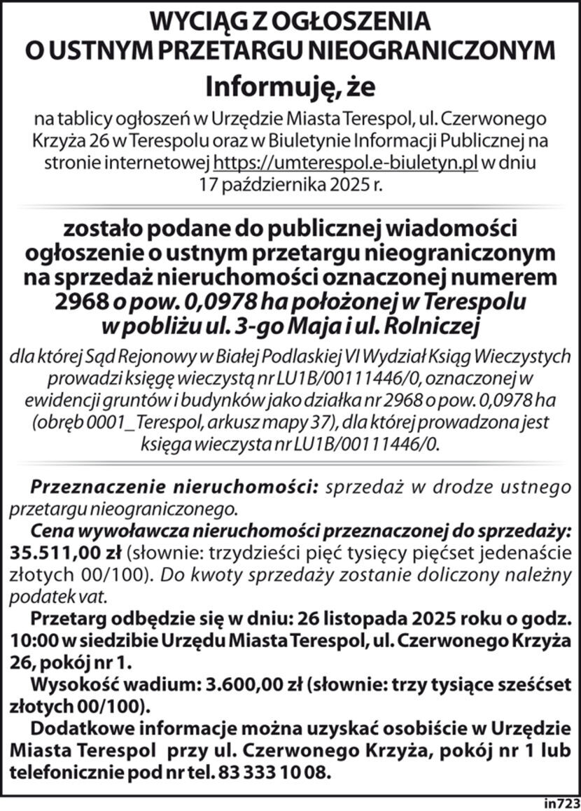 Wyciąg z ogłoszenia Urzędu Miasta Terespol