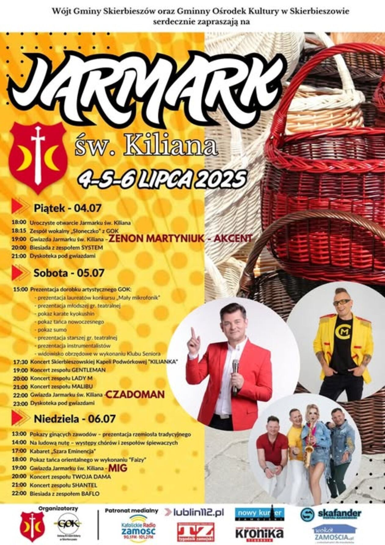Jarmark św. Kiliana 2025 potrwa tradycyjnie od piątku do niedzieli (4-6 lipca). Imprezę organizuje Urząd Gminy wraz z Gminnym Ośrodkiem Kultury w Skierbieszow. Już wiadomo, że wśród gwiazd wydarzenia będą: Zenon Martyniuk, a także MiG i Czadoman (szczegóły na plakacie poniżej).