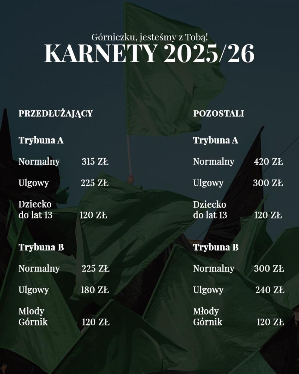 – Przed nami nowy sezon, nowe emocje i ten sam Klub – Twój Górnik! Wspólnie z Wami chcemy znów tworzyć niepowtarzalną atmosferę na stadionie przy Alei Jana Pawła II. Hasło tegorocznej kampanii karnetowej „Górniczku, jesteśmy z Tobą” to nie tylko słowa – to nasza wspólna deklaracja wsparcia, wierności i wiary w zielono-czarne barwy! Bądź z nami na trybunach – zachęcają działacze Górnika.