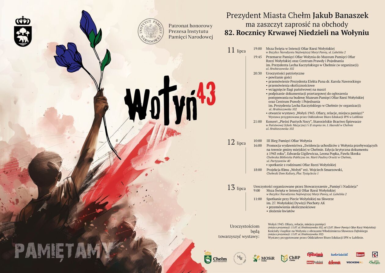 12 lipca o godz. 10:00 wystartuje III Bieg Pamięci Ofiar Wołynia, a o 16:00 w Chełmskiej Bibliotece Publicznej odbędzie się premiera publikacji dokumentującej losy uchodźców z Wołynia w Chełmie w 1943 roku. Spotkaniu towarzyszyć będzie rozmowa z rodzinami ofiar, a dzień zakończy projekcja filmu „Wołyń” w reżyserii Wojciecha Smarzowskiego o godz. 18:00 w Chełmskim Domu Kultury.