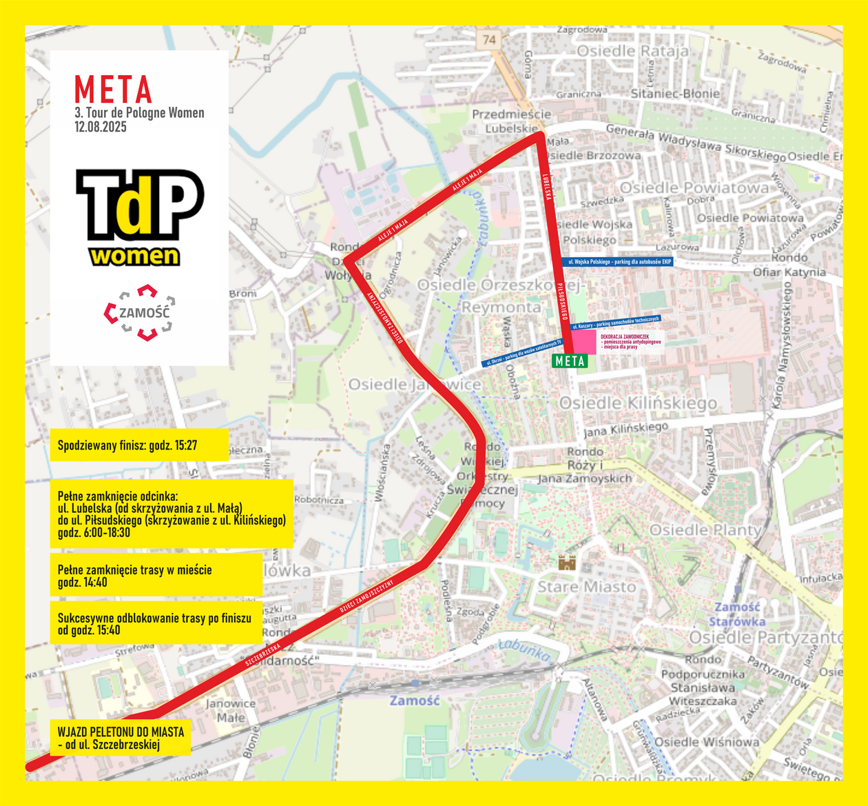Wrócić do miasta powinny po godz. 15 przejeżdżając w granicach Zamościa ulicami Szczebrzeską, Dzieci Zamojszczyzny, Al. 1 Maja, Lubelską oraz Piłsudskiego. Tutaj, w okolicy skrzyżowania z ul. Okrzei znajdować będzie się meta.
