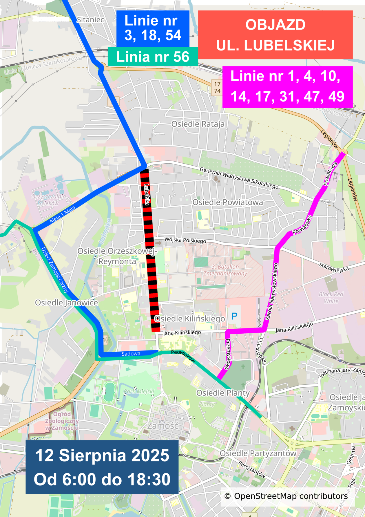 Od godz. 6 aż do 18.30 w ogóle nie będzie można jeździć ulicą Lubelską od skrzyżowania z ulicą Sikorskiego do ul. Wojska Polskiego. Zamknięta zostanie również ulica Piłsudskiego od skrzyżowania z ul. Woj. Polskiego do skrzyżowania z ul. Kilińskiego.