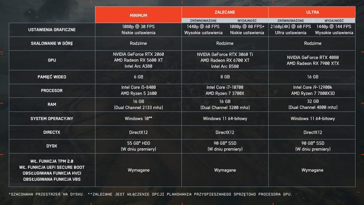 Wymagania „ultra” (ustawienia grafiki „wysokie, 1440p/144 FPS/ustawienia grafiki „ultra”, 4K/60 FPS):