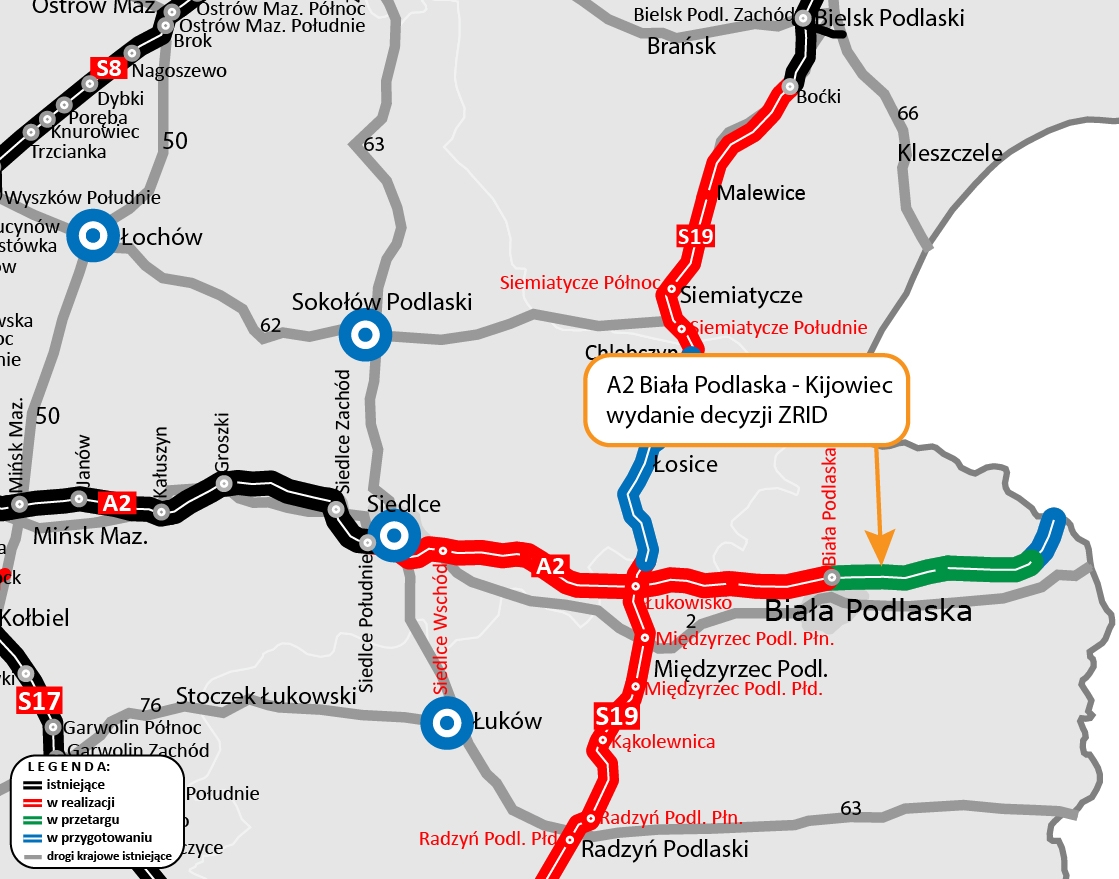 O wydanej przez wojewodę lubelskiego decyzji poinformowała dzisiaj Generalna Dyrekcja Dróg Krajowych i Autostrad. Jak wynika z jej komunikatu, dokument pozwoli przejść do kolejnego etapu przygotowań do budowy nowego odcinka A2 w województwie lubelskim. Chodzi o fragment długości 16,2 km pomiędzy węzłem Biała Podlaska, a położonej na wschód od niego, czyli w kierunku granicy z Białorusią, miejscowością Kijowiec. Droga przetnie gminy: Biała Podlaska, Rokitno i Zalesie.