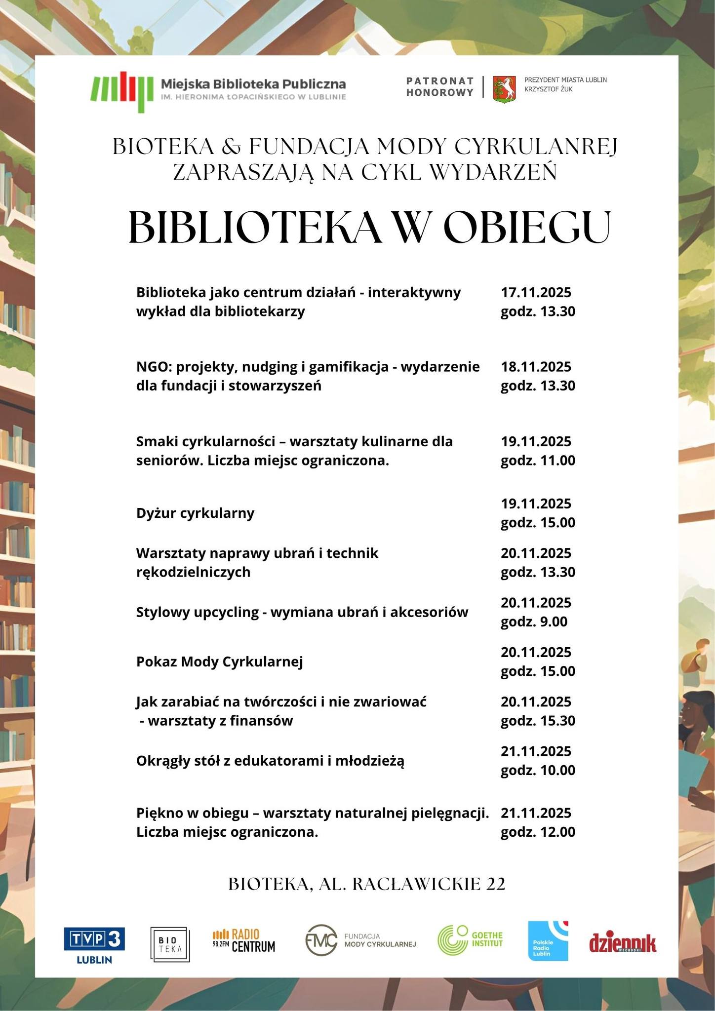 ,,Biblioteka w Obiegu’’ to wyjątkowe wydarzenie, które udowadnia, że w Lublinie kultura, edukacja i ekologia mogą tworzyć inspirującą przestrzeń do działań społecznych. Projekt realizowany jest pod patronatem Prezydenta Miasta Lublin, Krzysztofa Żuka .Za koordynację odpowiada Oliwia Gancarz we współpracy z prezeską Fundacji Mody Cyrkularnej, Agatą Zgliczyńską. Każdy może dołączyć – wstęp na wydarzenie jest bezpłatny.