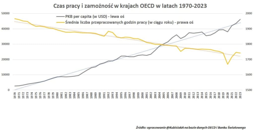 W największym uproszczeniu praca po 50 godzin tygodniowo to paliwo przemysłu XIX wieku. Nowoczesne gospodarki opierają się na kompetencjach, technologii, automatyzacji i strukturach, które średnią godzinę pracy zamieniają na złoto. Kilka dekad danych OECD pokazuje to aż do bólu klarownie. Tam, gdzie kraje bogaciły się, liczba przepracowanych godzin spadała. Krzywe idą w przeciwnych kierunkach PKB per capita do góry, a faktyczny czas pracy stopniowo w dół.
