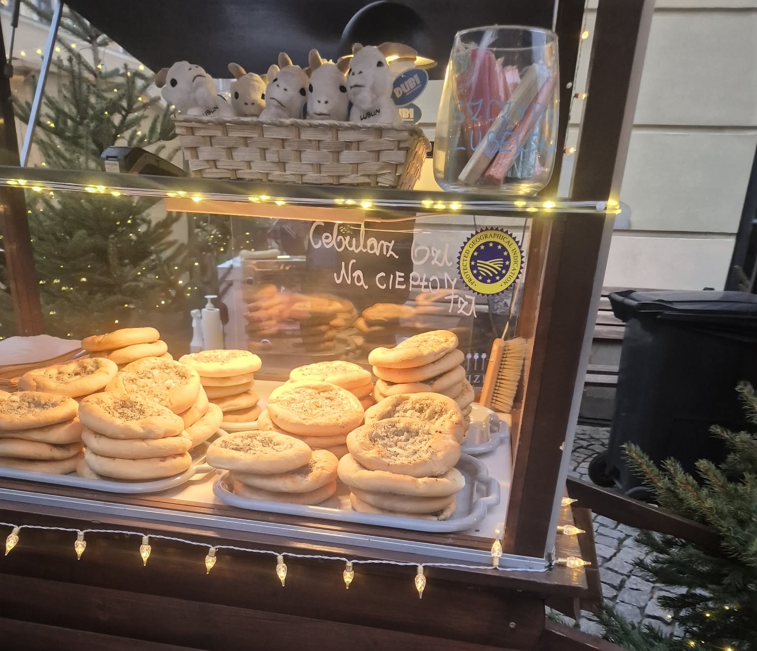 Jednak nie samymi napojami człowiek żyje. Co można zjeść na lubelskim jarmarku? Staropolski klasyk, czyli bigos dostać można za 25 zł. Dokładnie na tym samym straganie, w tej samej cenie są porcje pierogów (z mięsem i żurawiną lub z kapustą i grzybami). Tak jak wigilijnym klasykiem jest bigos, tak klasykiem lubelskim jest cebularz. Ten wypiek można dostać za 6 zł, a w wariancie na ciepło – 7 zł. Na innym stoisku cebularze są nawet po 3 zł, ale są wyraźnie mniejsze. Na tym samym straganie dostaniemy inne wypieki – chleb vermont za 10 zł, chleb borodyński za 8 zł, bajgle po 2,5 zł, chałkę z pieczarkami i serem za 13 zł, zapiekanki po 15 zł. Są też tzw. rollsy w trzech wariantach smakowych – każdy za 10 zł. Fani ciast znajdą tam cztery różne rodzaje – od 90 zł za strucle makową do 120 zł za pozostałe (serniki i pierniki).