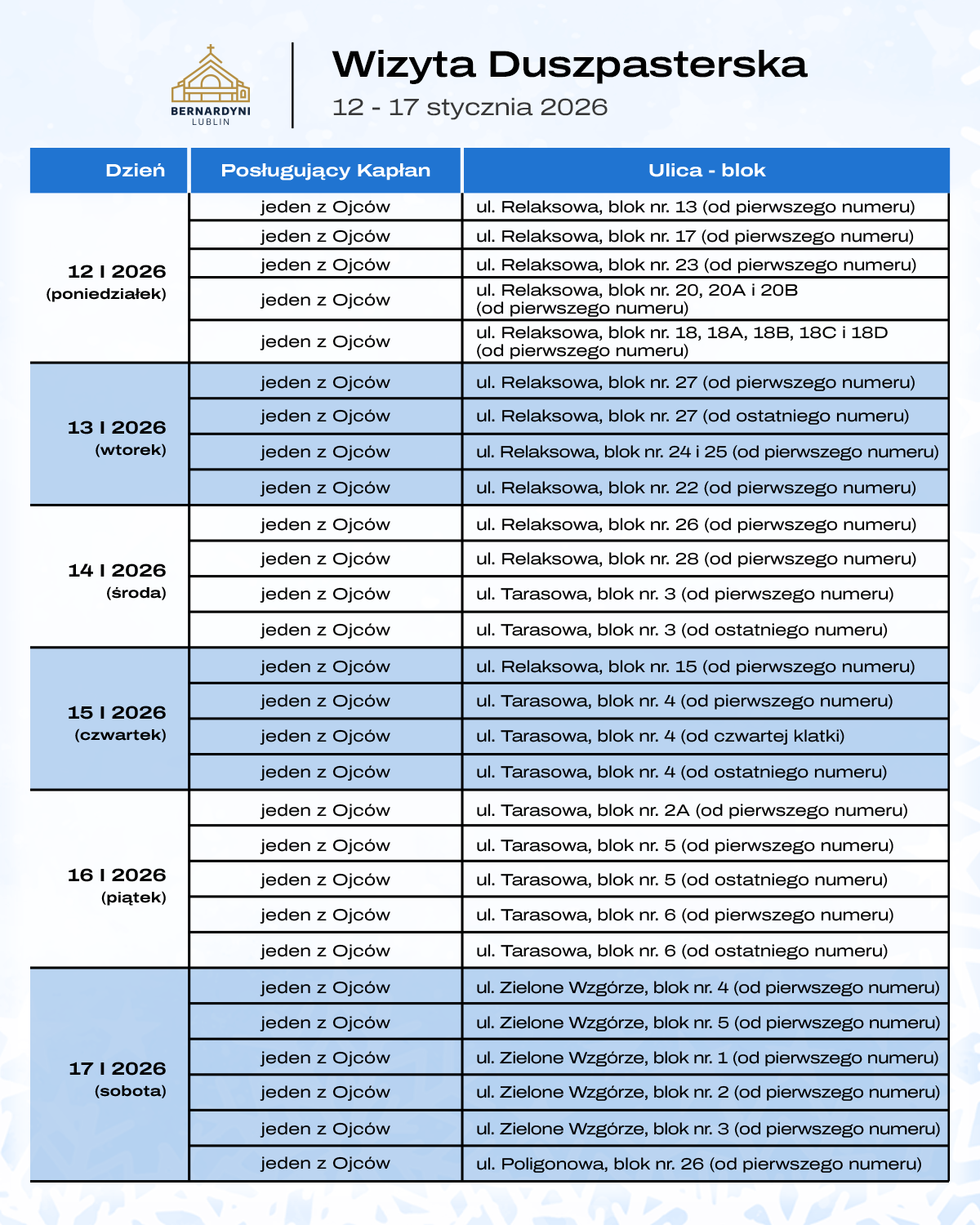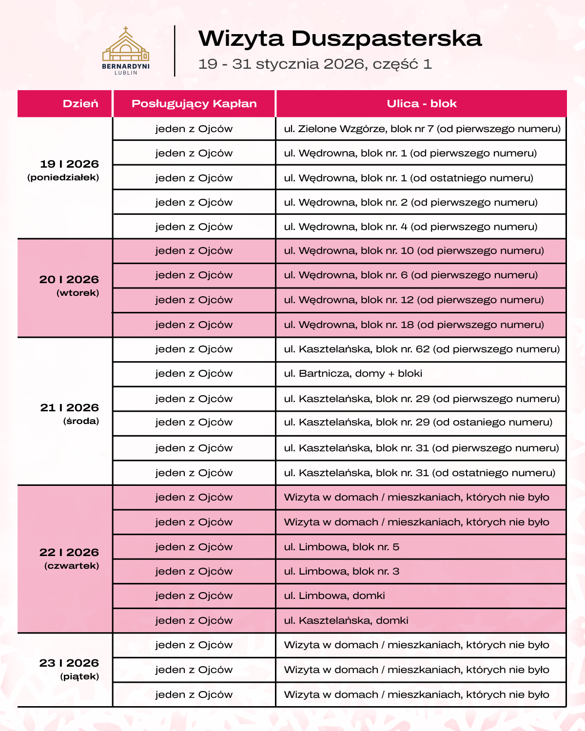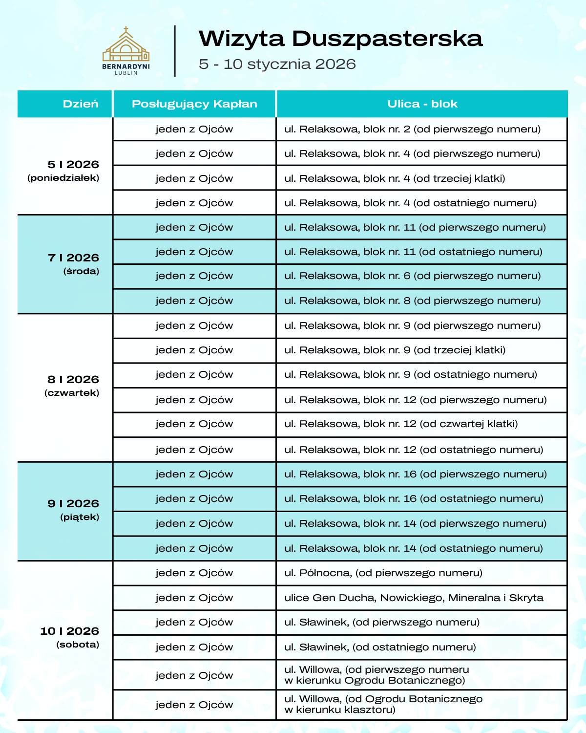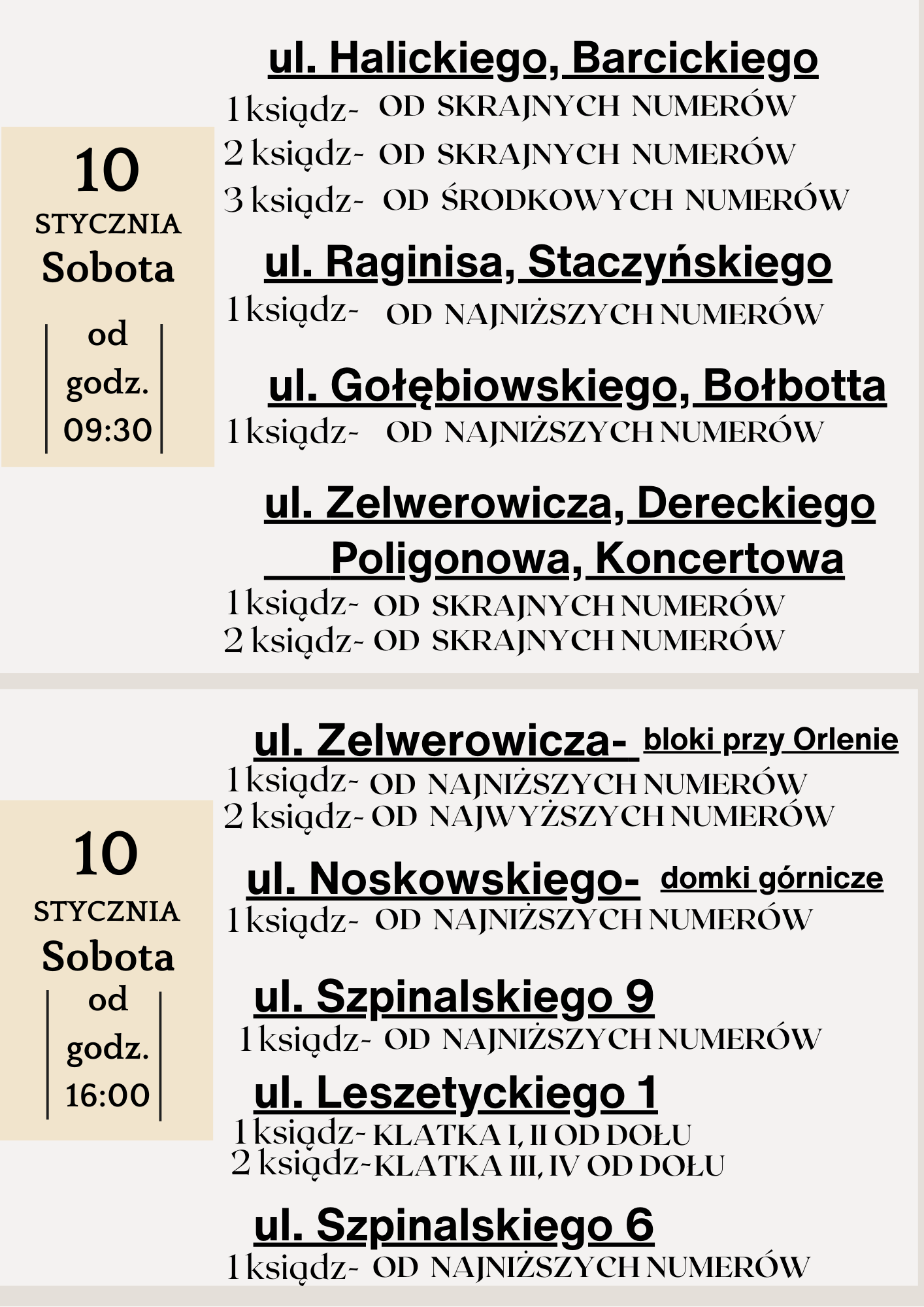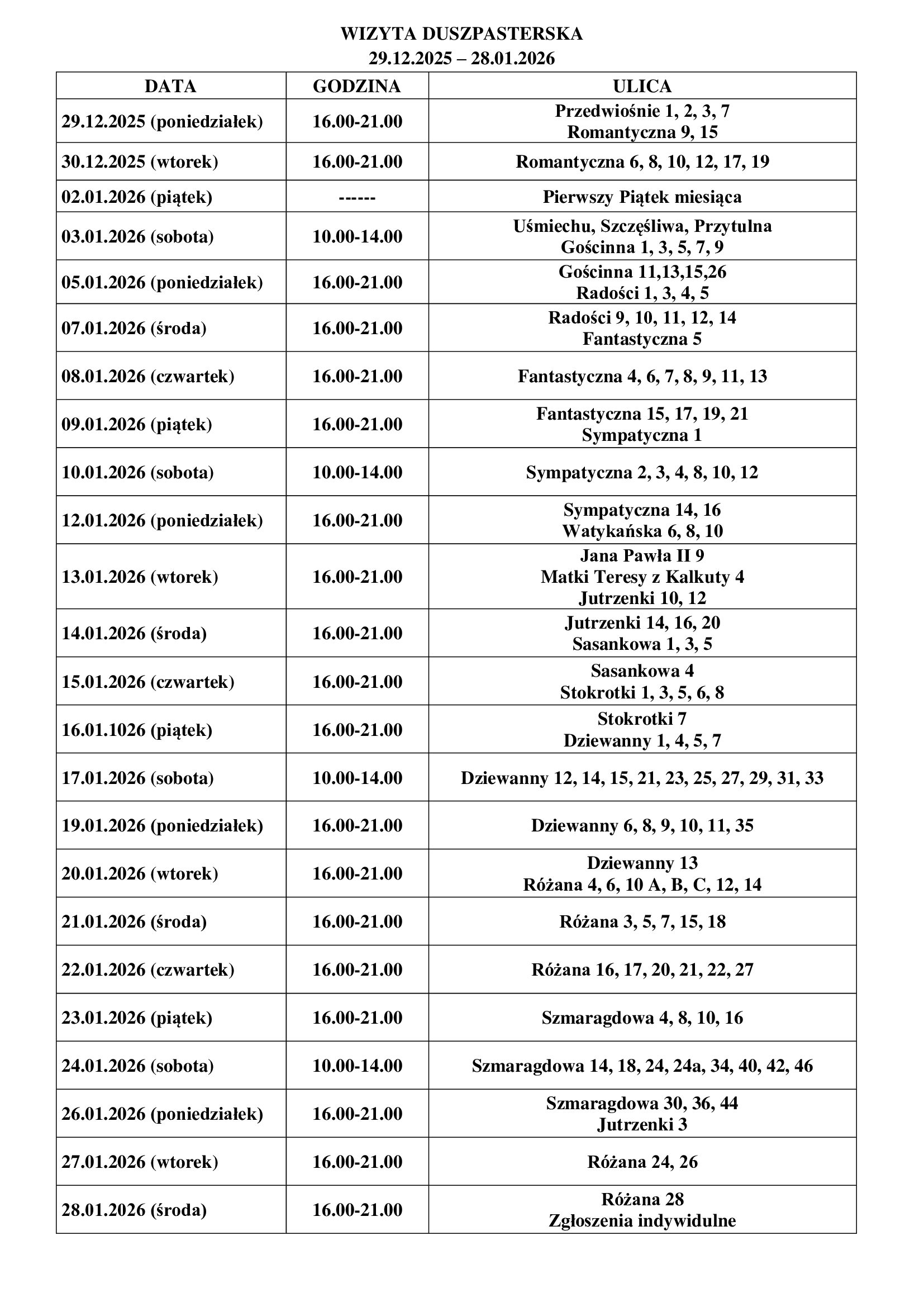 - 24.01-2026 r. – sobota: Bez przypisania ulic – dla wszystkich Parafian