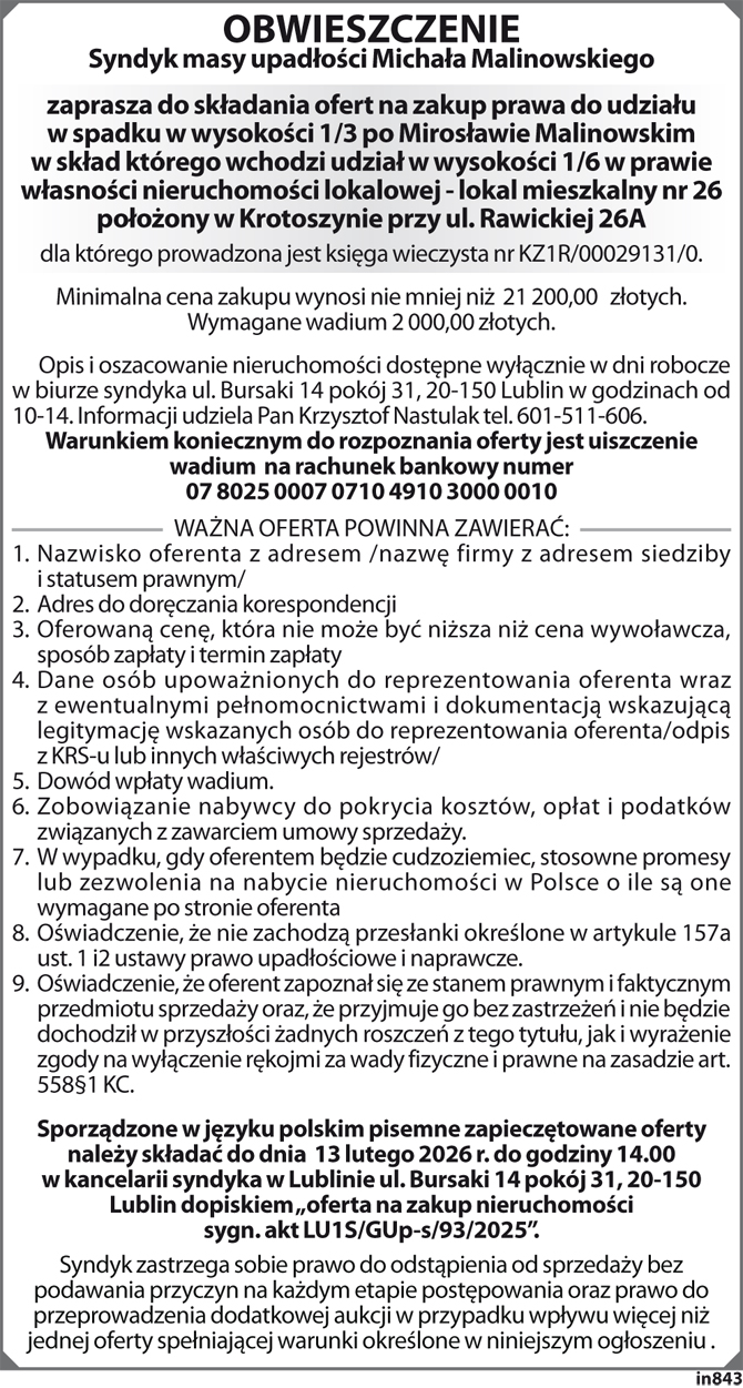 Ogłoszenie Syndyka Masy Upadłości Michała Malinowskiego