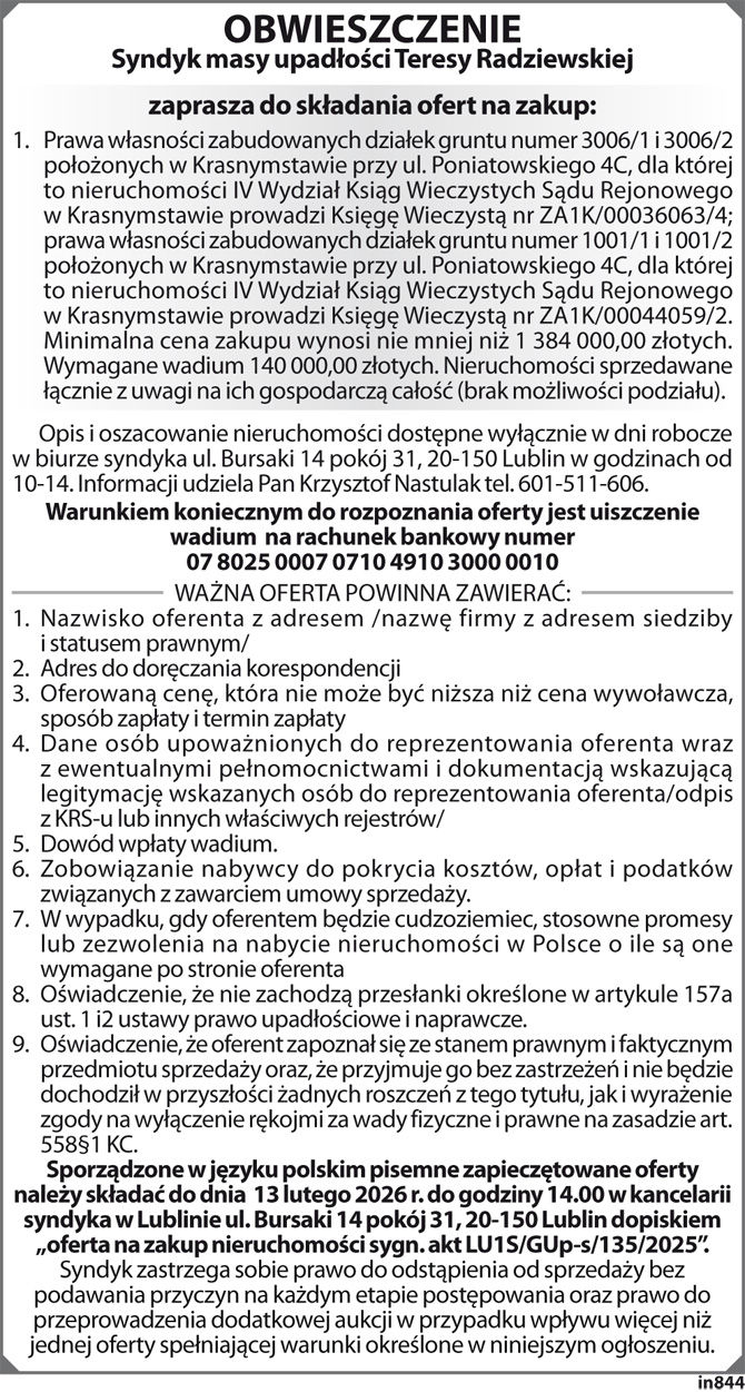 Ogłoszenie Syndyka Masy Upadłości Teresy Radziszewskiej