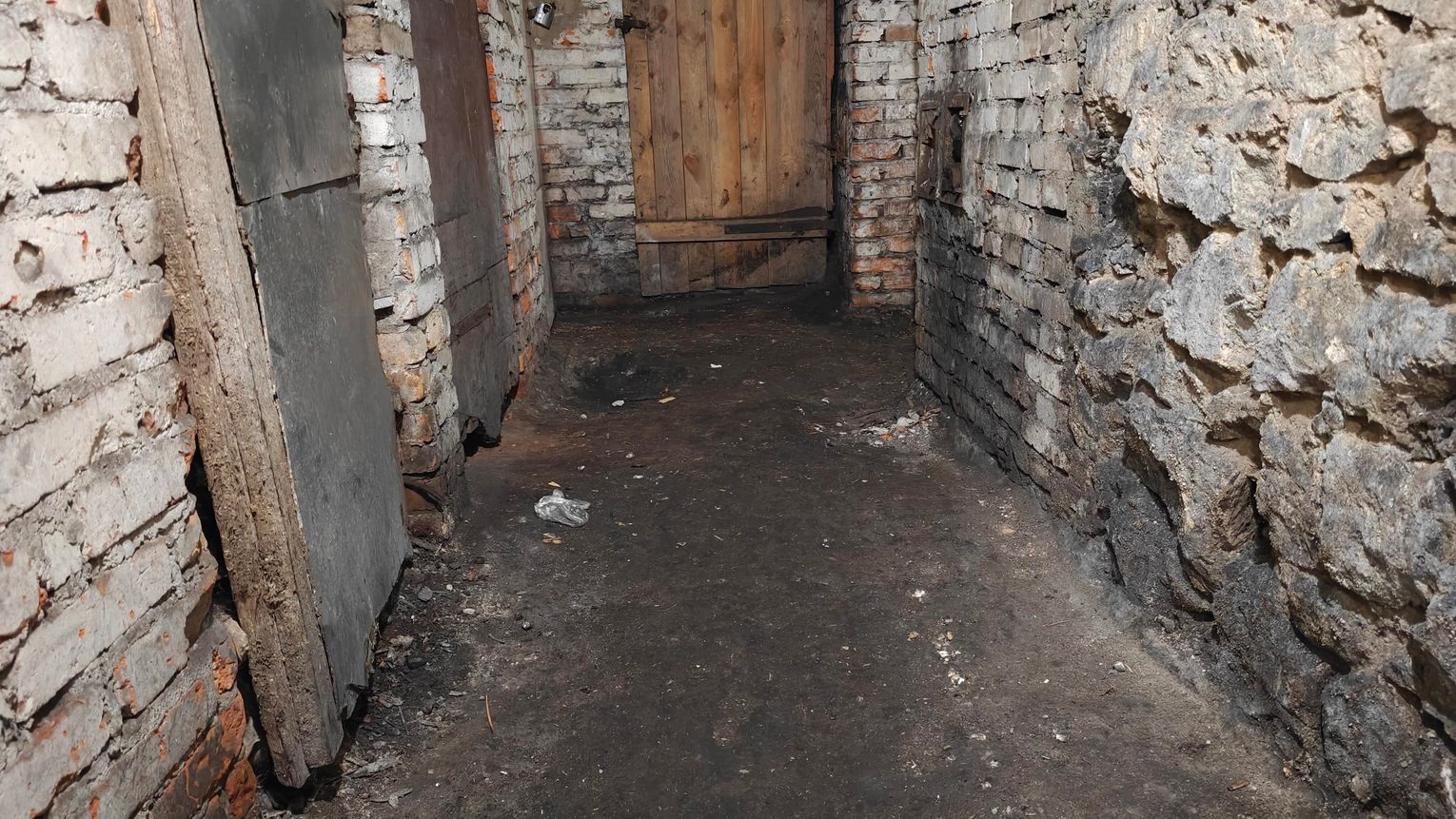 Do piwnic prowadzą strome, nierówne schody, bez posadzki, z klepiskiem i wilgocią.