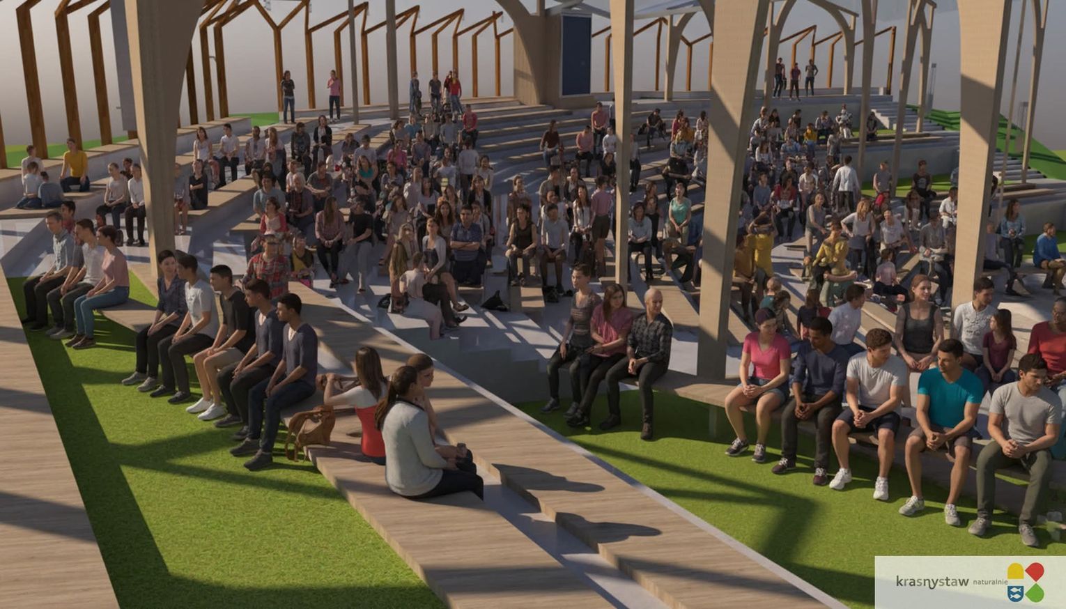 Projekt zakłada widownię na około 2000 miejsc, podzieloną na sektory. W centralnej części zaplanowano tradycyjne ławki, natomiast boczne strefy mają być zielone i rekreacyjne, z możliwością ustawienia leżaków. Dzięki temu przestrzeń będzie elastyczna – dostosowana zarówno do dużych koncertów plenerowych, jak i kameralnych wydarzeń czy kina letniego.