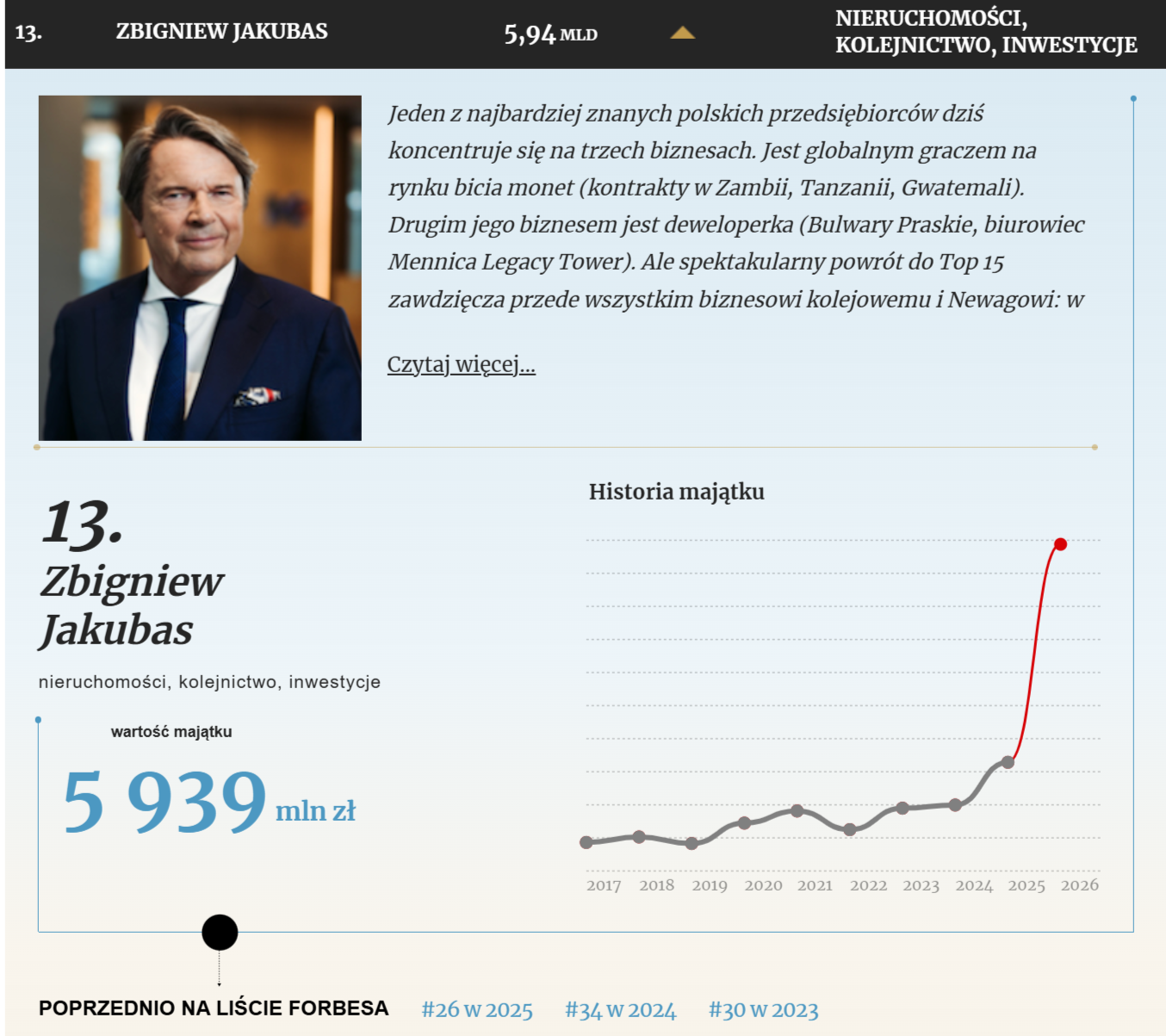 „Forbes” rokrocznie publikuje zestawienie stu najbogatszych Polaków. Tym razem na pierwszym miejscu znalazł się Michał Sołowow, na drugim Tomasz Biernacki, na trzecim Jerzy Starak, na czwartym Sebastian Kulczyk, a na piątym rodzina Grzebitów od Media Expert. Z powszechnie znanych nazwisk w pierwszej dwudziestce figurują jeszcze chociażby Zygmunt Solorz i jego sukcesorzy, Dominika Kulczyk i Rafał Brzoska. Trzynastą pozycję zajął Zbigniew Jakubas.