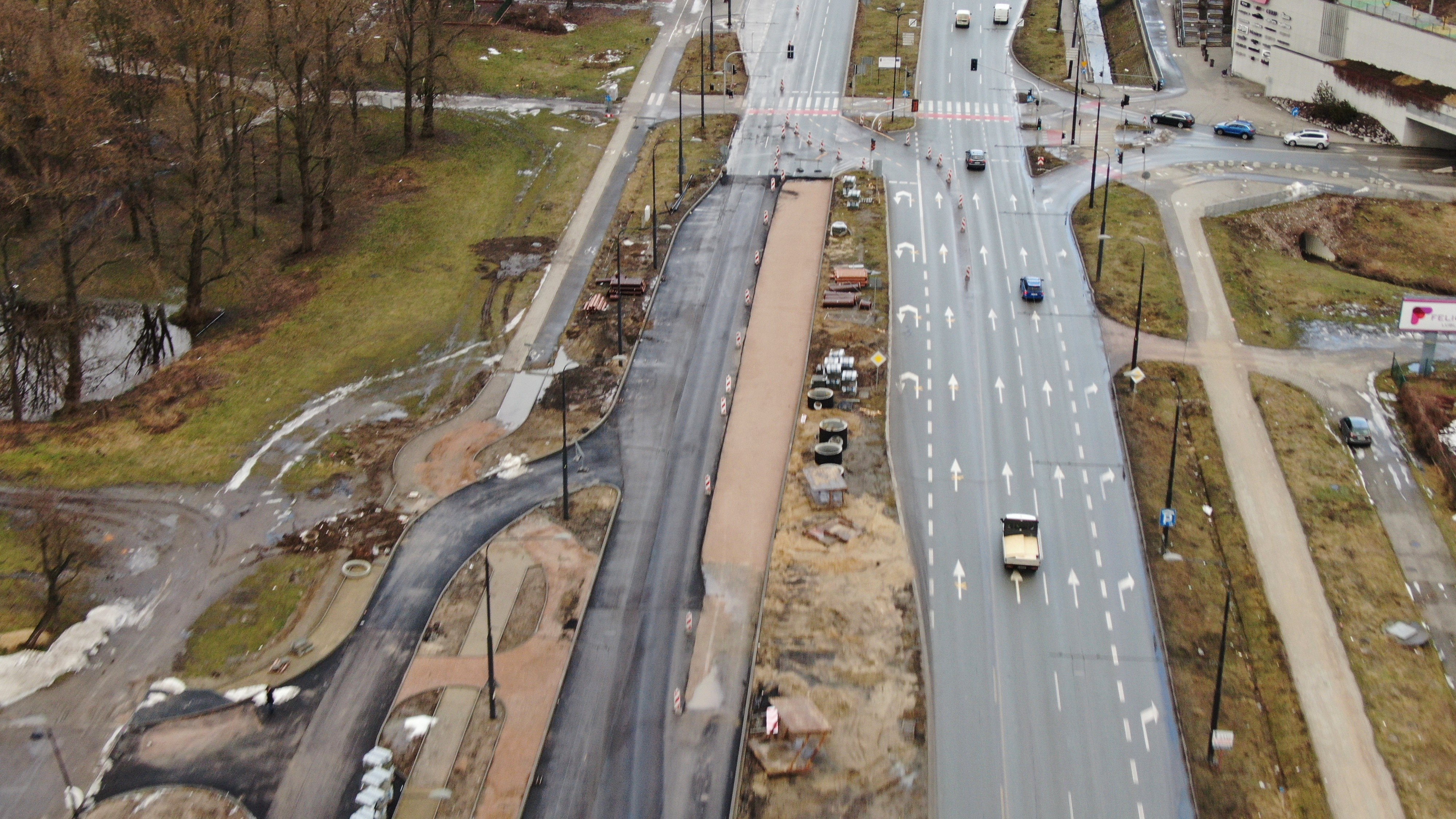 Równolegle rozpoczynają się roboty drogowe w rejonie inwestycji. Po zachodniej stronie prowadzone są prace przy drodze serwisowej oraz ciągach pieszo-rowerowych. Wykonawca ustawia krawężniki i układa płytki chodnikowe, a także przygotowuje infrastrukturę pod okablowanie oświetlenia drogowego.