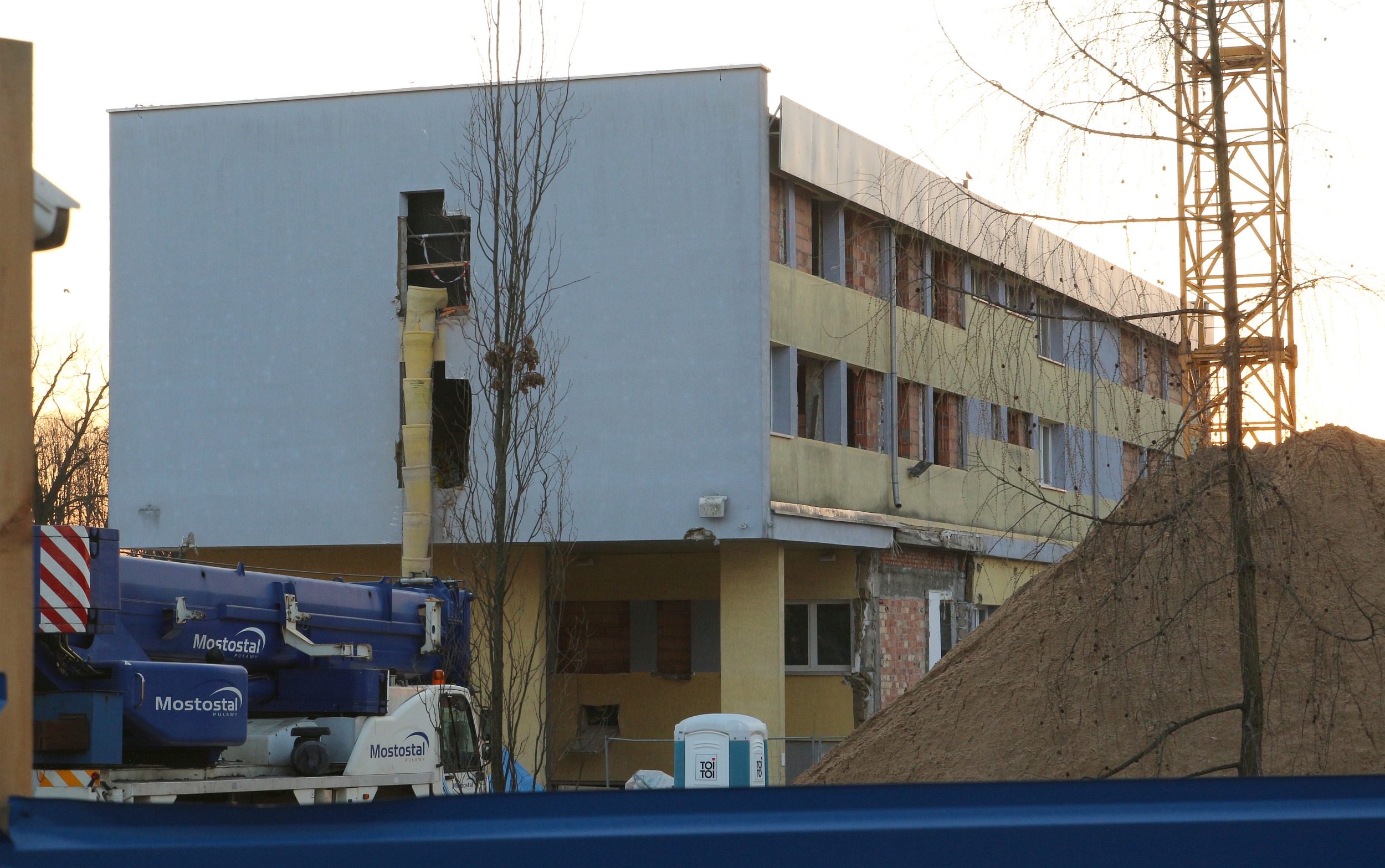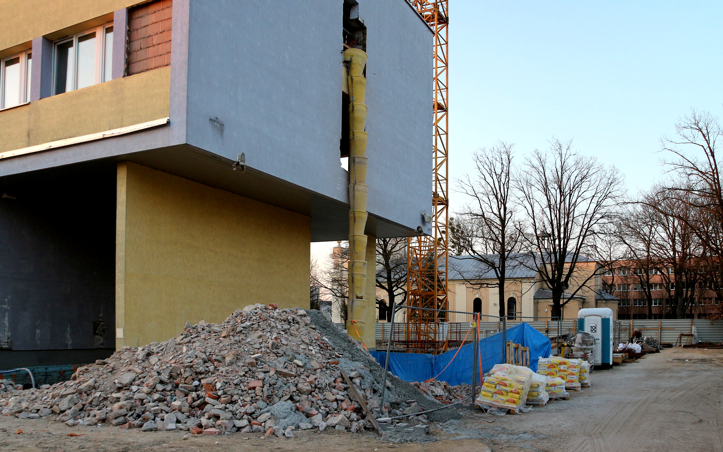 Mieszkańcy Puław mogą obserwować prace rozbiórkowe trwające za otoczonym wysokim ogrodzeniem placu budowy pomiędzy miejskim Ratuszem, a kościołem "garnizonowym" pw. MBR. Skuwane i wymontowywane jest stare wyposażenie, instalacje, okładziny, stolarka itp. Z budynku znikają kolejne okna oraz elementy starej elewacji. Jak będzie wyglądała nowa - tego nie wiemy, bo do dzisiaj nie opublikowano żadnej, nawet najprostszej wizualizacji. Według zapisów projektu - ściany odnowionego i powiększonego budynku mają być utrzymane w kolorze szarym.
