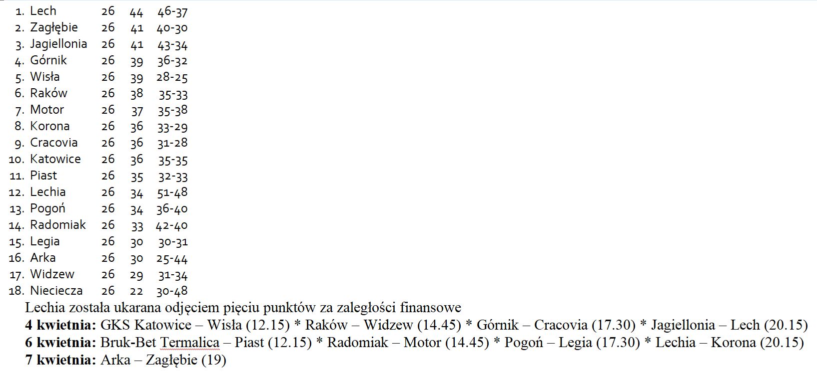 Z innych meczów 26. kolejki warto zwrócić uwagę na remis Legii z Rakowem. Jean-Pierre Nsame najpierw zawalił bramkę, bo w swoim polu karnym wystawił piłkę, jak na tacy do rywala, a Lamine Diaby-Fadiga skorzystał z prezentu i „Medaliki” prowadziły od szóstej minuty. Nsame się jednak zrehabilitował. W 71 minucie skutecznie wykonał rzut karny, dzięki czemu „Wojskowi” wywalczyli punkt. A „oczko” dopisane do tabeli pozwoliło Legii opuścić strefę spadkową.