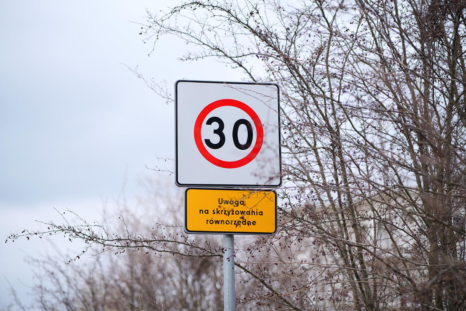 Kilkadziesiąt metrów dalej jest zniesienie ograniczenia do 30 km/h, a pod nim znak D-40 “Strefa zamieszkania”.