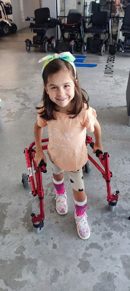 My natomiast nie mamy wyznacznika. Widzimy postępy u Niny i u innych dzieci, ale tak naprawdę codzienna rehabilitacja to jest praca nad każdym mięśniem, nad połączeniami nerwowymi. Ninka stoi, chodzi w chodziku, porusza się, jeździ na wózku, bo długo nie wytrzymuje chodząc. Cały czas walczymy o mięśnie posturalne.