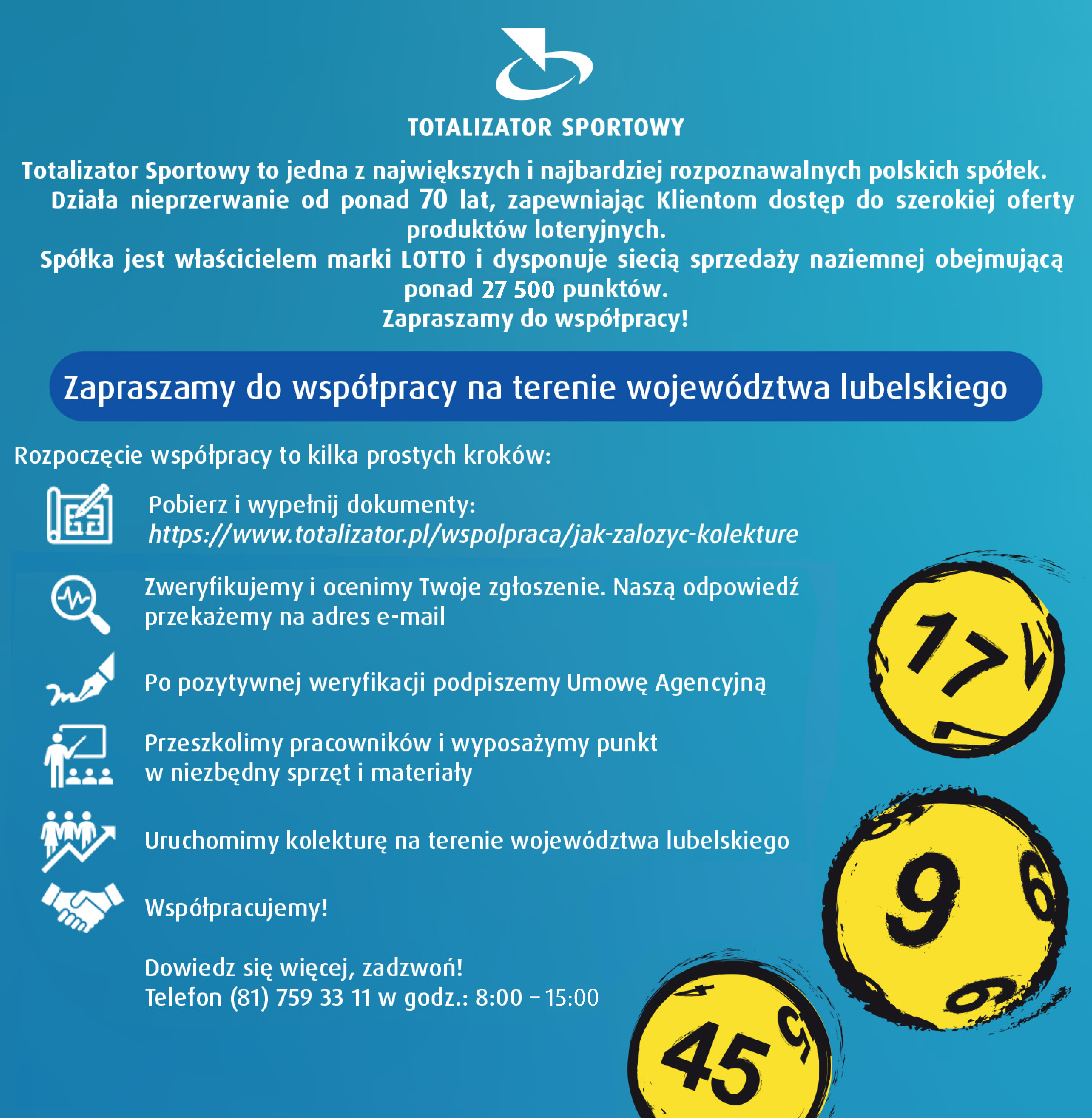 Wielkie wygrane przyciągają Graczy, a to doskonała okazja dla lokalnego biznesu. Zachęcamy przedsiębiorców z regionu do nawiązania współpracy z Totalizatorem Sportowym i otwierania kolektur we własnych punktach sprzedaży.
