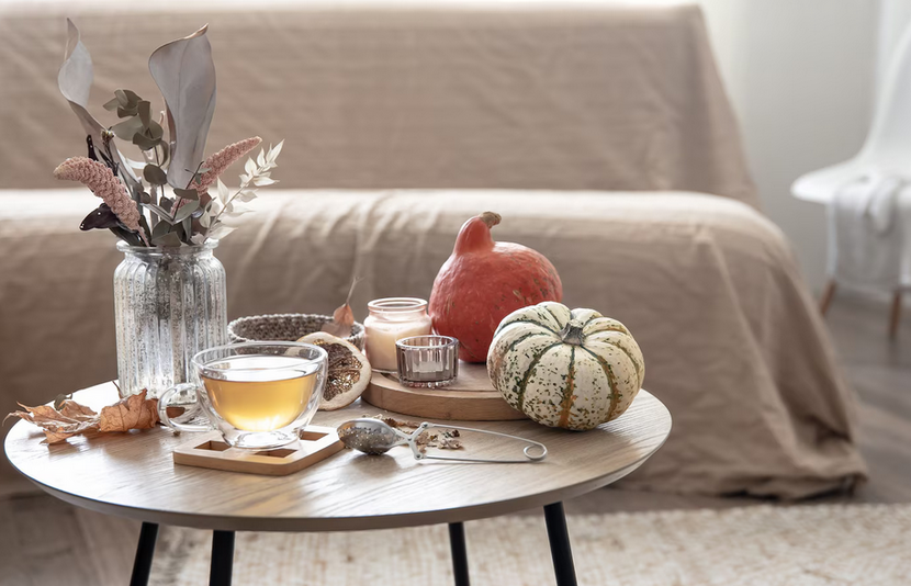 Pierwszym krokiem do jesiennej metamorfozy może być choćby przemalowanie ścian na nowy kolor. Jeśli to dla Ciebie zbyt duża zmiana, lub nie masz tyle czasu to spróbuj wprowadzić nowe barwy do swoich wnętrz choćby w postaci tekstyliów. Zamiast tradycyjnych ciepłych odcieni warto rozważyć głębokie, ale neutralne kolory, które wprowadzają spokój i tworzą wrażenie uporządkowania. Szarości, oliwkowe zielenie czy ciemniejsze beże świetnie komponują się z naturalnymi materiałami i nadają wnętrzu bardziej dojrzałego charakteru.