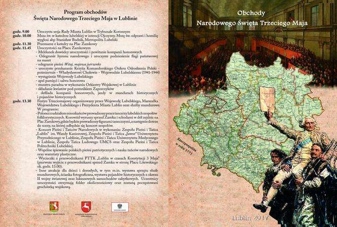 We wtorek o 8.00 uroczyste podniesienie flagi państwowej na maszt przed gmachem Lubelskiego Urzędu Wojewódzkiego przy ul. Spokojnej 1, o 8.20 uroczyste podniesienie flagi państwowej na maszt na balkonie lubelskiego Ratusza przy pl. Łokietka 1. • W środę o godz. 9.00 uroczysta sesja Rady Miasta Lublin w Trybunale Koronnym; o godz. 10.00 msza w katedrze lubelskiej w intencji Ojczyzny; 11.30 przemarsz z katedry na plac Zamkowy gdzie o godz. 11.45 zaczną się uroczystości. O godz. 13 zacznie się „Festyn 3 Majowy” organizowany wspólnie przez: wojewodę lubelskiego, marszałka województwa lubelskiego, prezydenta Lublin i służby mundurowe. Festyn rozpocznie polonez z udziałem mieszkańców. W programie jest też koncert pieśni i tańców narodowych, wspólne śpiewanie polskich pieśni patriotycznych i nauka tańców narodowych, wycieczki z przewodnikami, wystawy, pokazy oraz inne.