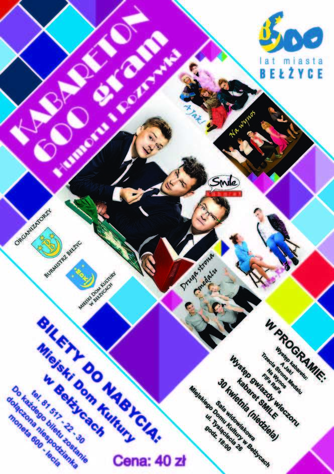 "600 gram humoru i rozrywki" w Miejskim Domu Kultury (ul. Tysiąclecia 26) zacznie się o godz. 18. Podczas imprezy wystąpią kabarety – A Jak! , Trzecia Strona Medalu, Na Wynos, FiFa-RaFa. Gwiazdą wieczoru będzie kabaret SMILE. Bilety (40 złotych) można kupić w Miejskim Domu Kultury w Bełżycach. Do każdego biletu zostanie dołączona niespodzianka – moneta 600-lecia Bełżyc.
