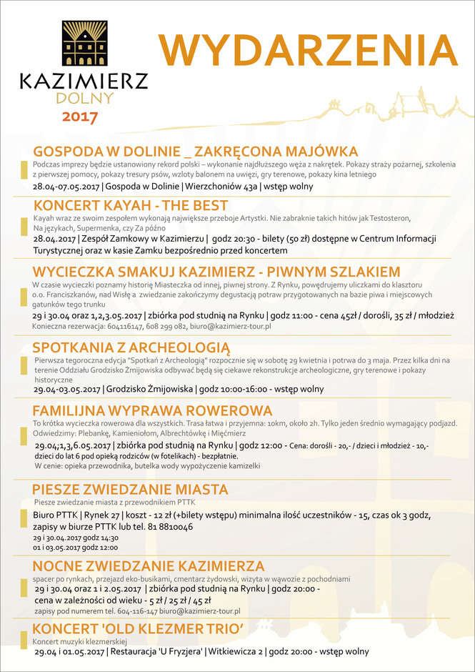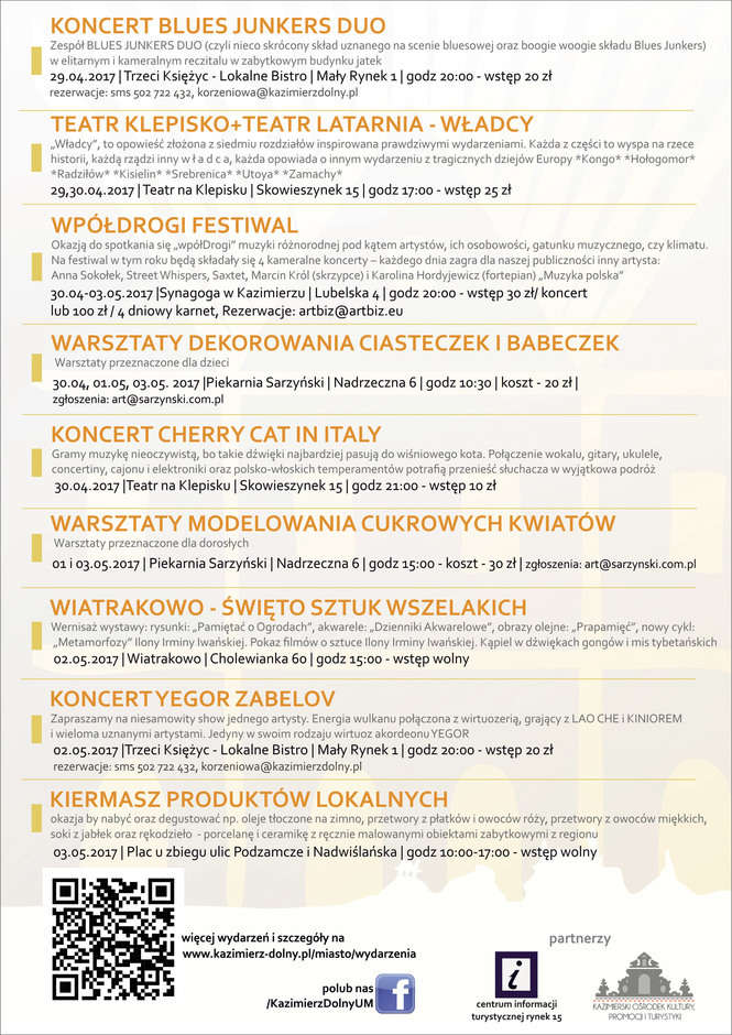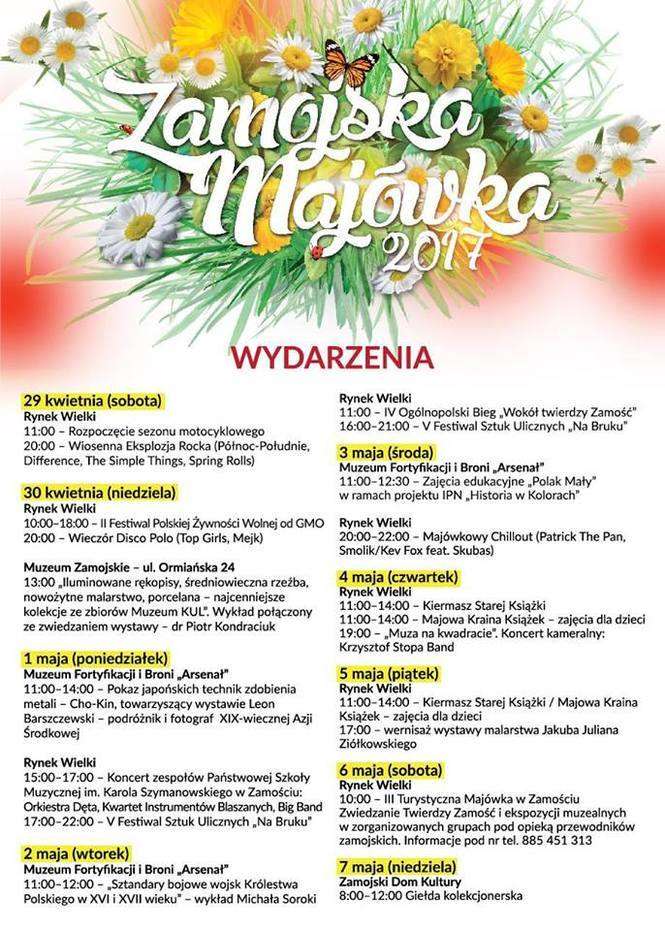 W sobotę przed południem na Rynek wjadą motocykliści, a wieczorem od godz. 20 rozpocznie się Wiosenna Eksplozja Rocka (Północ-Południe, Difference, The Simple Things, Spring Rolls). • W niedzielę rozpocznie się II Festiwal Polskiej Żywności Wolnej od GMO. Na Rynku swoje stoiska rozstawi ok. 40 wystawców. Będzie można kupić wędliny, ekologiczne sery, roztoczańskie miody, soki z owoców i warzyw, oleje tłoczone na zimno i wiele innych zdrowych produktów. Na scenie wystąpią zespoły artystyczne. Od godz. 20 rozpocznie się blok miejski, czyli popularne i lubiane koncerty zespołów disco-polo (TOP GIRLS, MEJK). • 1 i 2 maja V Festiwal Sztuk Ulicznych „Na Bruku”: pokazy ognia, sztuk kuglarskich i scenek teatralnych. • 3 maja Majówkowy Chillout. Od godz. 20 Patrick The Pan a później Smolik, KEV FOX, Skubas.
