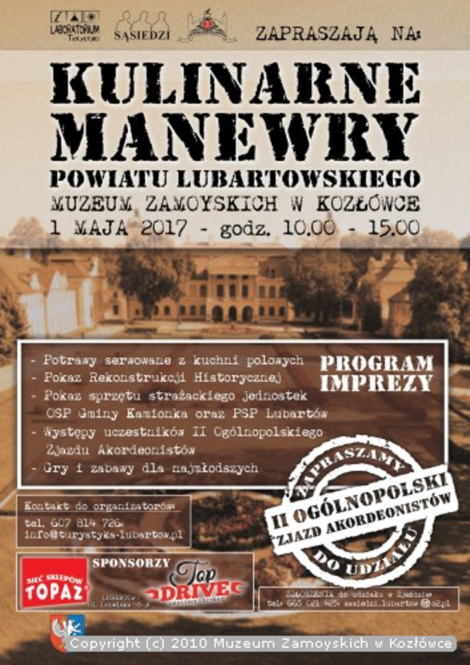 Muzeum zaprasza na Strażacką Majówkę, Manewry Kulinarne i II Ogólnopolski Zlot Akordeonistów. – Temat strażacki jest nawiązaniem do tradycji strażackich Michała Zamoyskiego, dzięki którym utworzono w Kozłówce Sekcję Straży Ogniowej. W ramach majówki strażacy zaprezentują się pokazy możliwości bojowych, wystawią swoje wozy strażackie – mówi Adam Kościańczuk z muzeum w Kozłówce. To tylko cześć atrakcji, jakie czekaj na gości pałacu. Na dziedzińcu będzie trwać wielkie gotowanie w ramach Festiwal Kuchni Polowych okraszone występami najlepszych akordeonistów w Polsce. • 2 maja w pałacu pojawi się policja...w ramach majówki. Mundurowi zaprezentują swoje zabawki – samochody i motocykle. Przeprowadzą także kursy udzielania pierwszej pomocy, prezentacje dotyczące bezpieczeństwa w ruchu drogowym oraz animacje dla dzieci – kończy Adam Kościańczuk.