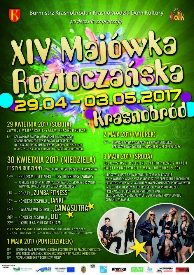 Cykl zabaw, koncertów, zawodów, rajdów i spotkań potrwa do 3 maja. W sobotę o poranku nad miejscowym zalewem zaczną się spławikowe zawody wędkarskie o mistrzostwo Krasnobrodzkiego Towarzystwa Wędkarskiego. • 30 kwietnia o 16.00 na placu Siekluckiego rozpocznie się blok gier i konkursów dla najmłodszych, połączony z rodzinnym turniejem wiedzy o obszarze, należącym do Rybackiej Lokalnej Grupy Działania „Roztocze”. W programie są również pokazy „Zumba Fitness”, koncerty folkowej grupy „Janki”, discopolowych zespołów „Camasutra” i „Lili” oraz dyskoteka pod gwiazdami. Przez cały czas do dyspozycji uczestników majówki będą stoiska handlowe i gastronomiczne. • 1 maja zaplanowano rajdy: rowerowy i nordic walking, które zakończą wspólne ognisku w dolinie św. Rocha. • 2 maja na 17.00 KDK zaprasza na otwarcie wystawy zegarów z kolekcji Dariusza Polanowskiego. • 3 maja mieszkańcy i władze spotkają się o godz. 9.00 na mszy w intencji Ojczyzny w kościele pod wezwaniem Nawiedzenia Najświętszej Marii Panny. Eucharystię poprzedzi program artystyczny, który w tym roku przygotowują uczniowie Zespołu Szkół Podstawowych w Krasnobrodzie. Po mszy uczestnicy obchodów przejdą pod Pomnik Konstytucji 3 Maja.