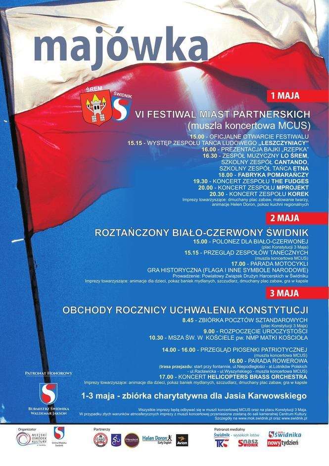 Dzień Flagi rozpocznie się od wspólnego odtańczenia poloneza na placu Konstytucji 3 Maja. Skąd barwnym korowodem przejdą później do muszli koncertowej, gdzie rozpoczną się występy zespołów tanecznych działających na terenie miasta. I Przegląd Zespołów Tanecznych Roztańczony biało – czerwony Świdnik będzie od godz. 15 w muszli koncertowej Miejskiego Centrum Usług Socjalnych (ul. Wyszyńskiego 5),. • W środę oficjalne uroczystości rozpoczną się na pl. Konstytucji 3 Maja od odśpiewania hymnu Polski. Następnie zaplanowano przemówienia władz. Pod pomnikiem Konstytucji 3 Maja zostaną złożone też kwiaty. Następnie uczestnicy uroczystości przejdą do kościoła Najświętszej Maryi Panny Matki Kościoła, w którym o godz. 10.30 rozpocznie się msza.