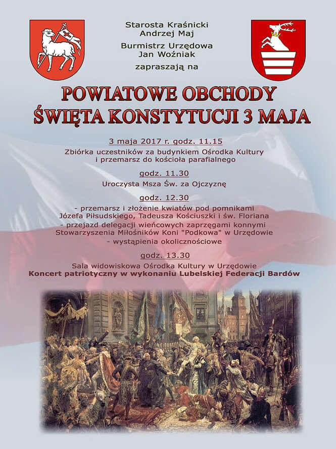 Powiatowe obchody uroczystości z okazji 226. rocznicy uchwalenia Konstytucji 3 Maja rozpoczną się od mszy o godz. 11.30 w miejscowym kościele. O godz. 13.30 rozpocznie się zaś koncert Lubelskiej Federacji Bardów w Ośrodku Kultury w Urzędowie. Organizatorami dochodów są Urząd Miejski w Urzędowie i Starostwo Powiatowe w Kraśniku.