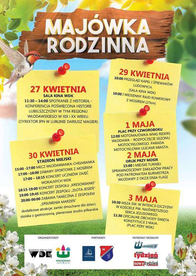 • 30 kwietnia, godz. 15 - Włodawianka Włodawa podejmie lidera IV ligi Chełmiankę Chełm. Po meczu będzie można wziąć udział w zabawach sportowych przygotowanych przez włodawski MOSiR lub oglądać występy artystyczne. Na scenie zaprezentują się uczestnicy zajęć wokalnych WDK, zespół Kresowianki i Złota Jesień. Nie zabraknie również stoisk gastronomicznych i atrakcji dla dzieci. Całość zakończy zabawa taneczna z zespołem Spełnienia Marzeń.