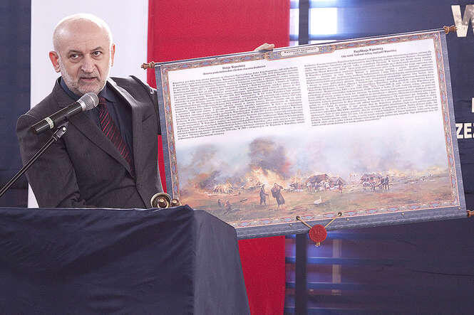 Pomysłodawca powstania obrazu, Ryszard Chruścicki prezentuje dzieło Kazimierza Korzeniowskiego