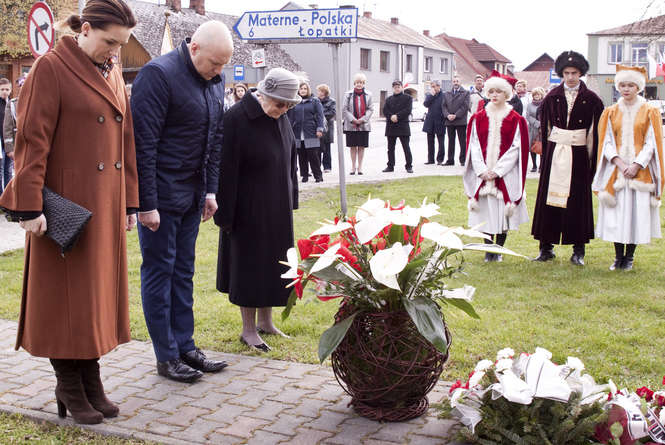 Delegacja władz gminy Wąwolnica składa kwiaty pod tablicą upamiętniającą pacyfikacje wioski w 1946 roku