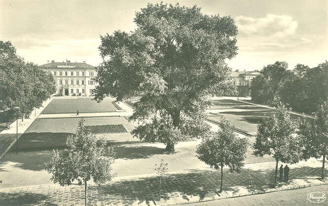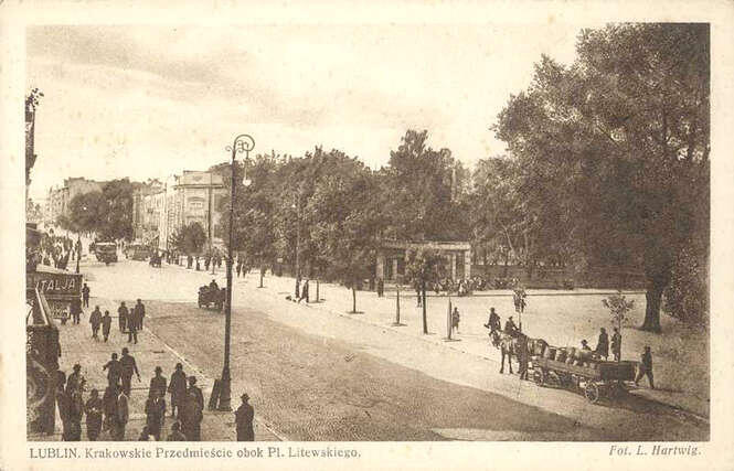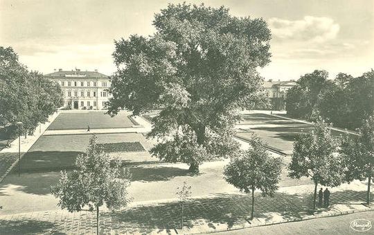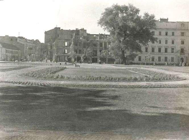 Ruiny budynków na rogu Krakowskiego Przedmieścia i ulicy Kościuszki w Lublinie, zniszczone w czasie bombardowania Lublina we wrześniu 1939 r. Po prawej Baobab