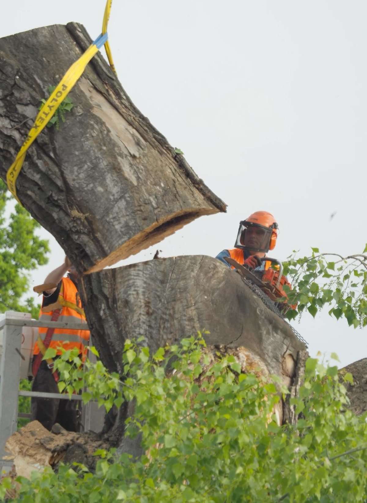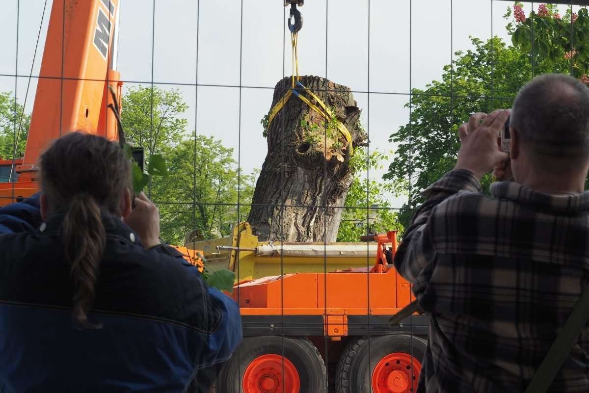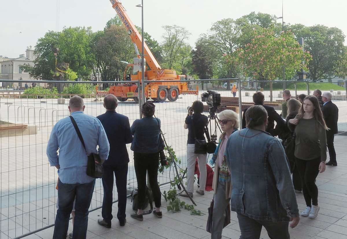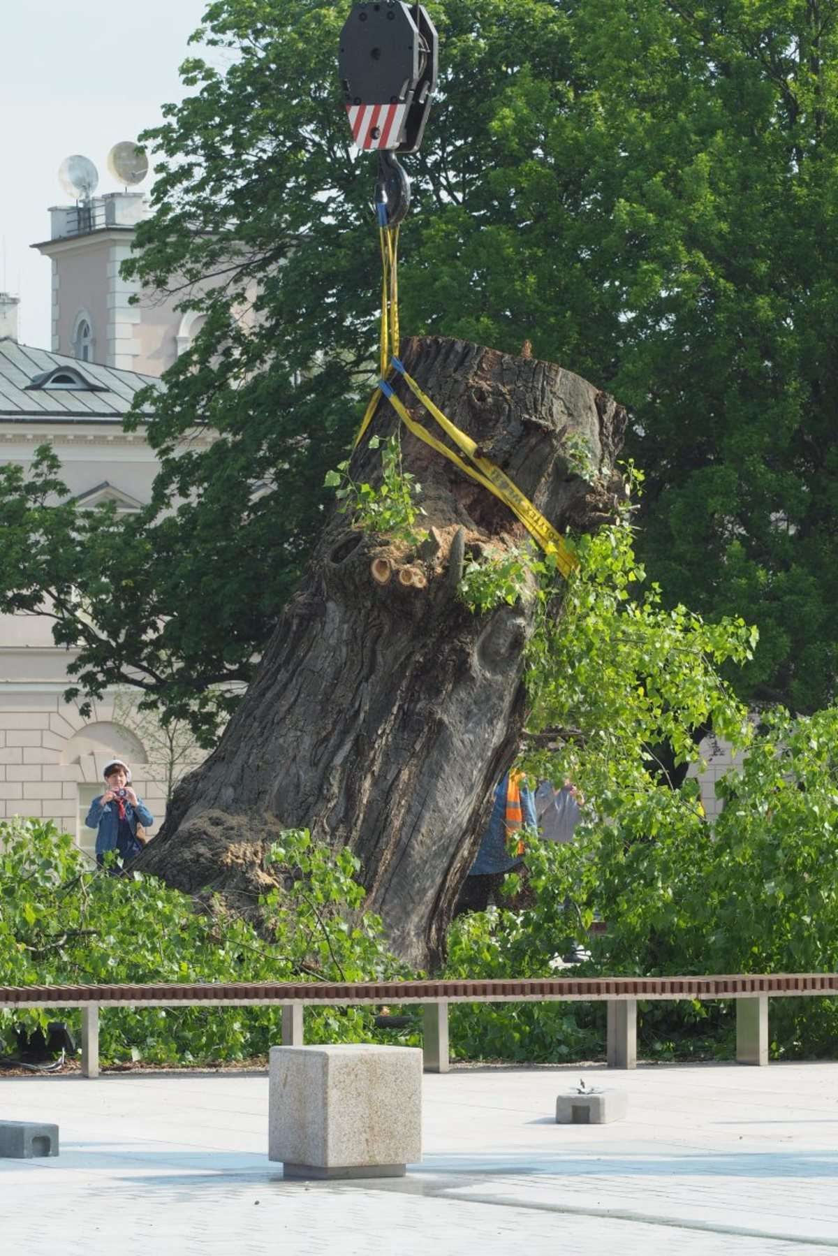 Nieco ponad 2,5 godziny trwała operacja usunięcia z pl. Litewskiego przeszło 120-letniej topoli czarnej zwanej zwyczajowo Baobabem. Całą operację obserwowały zza ogrodzenia grupy przechodniów i osób, które przyszły specjalnie po to by pożegnać się z drzewem. Fot. Maciej Kaczanowski