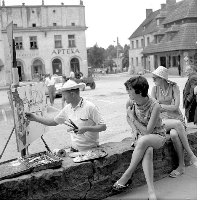 Rynek był i nadal jest głównym celem wycieczek. Można tu było spotkać znanych malarzy przy sztalugach - na zdjęciu Franciszek Kmita, który spędził w Kazimierzu równo 60 lat