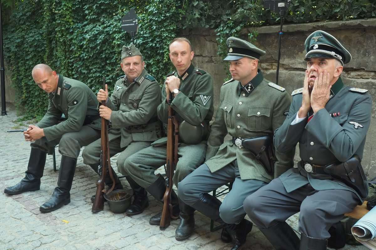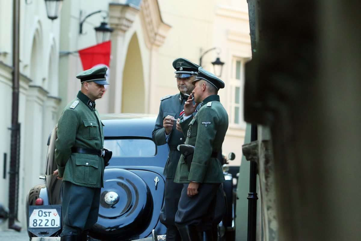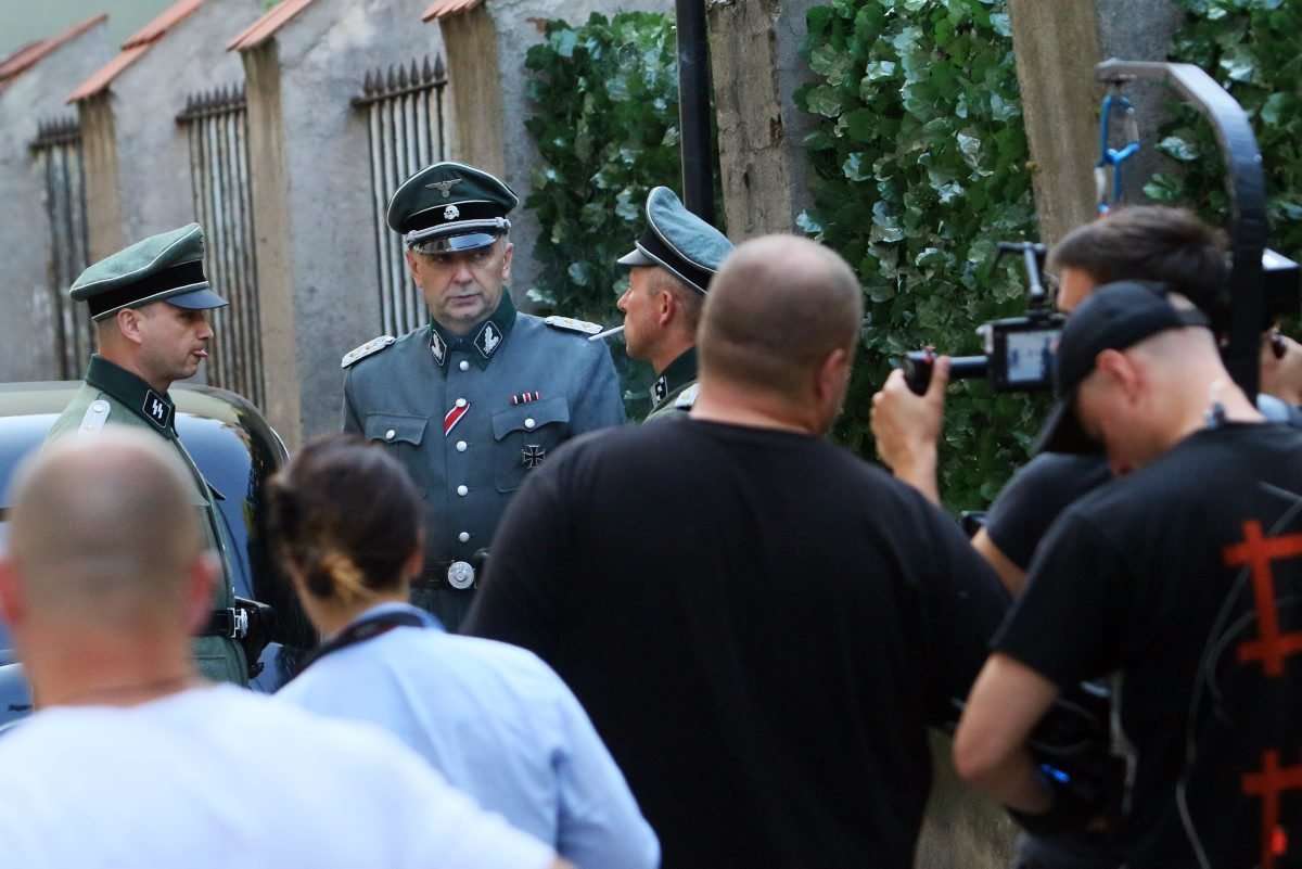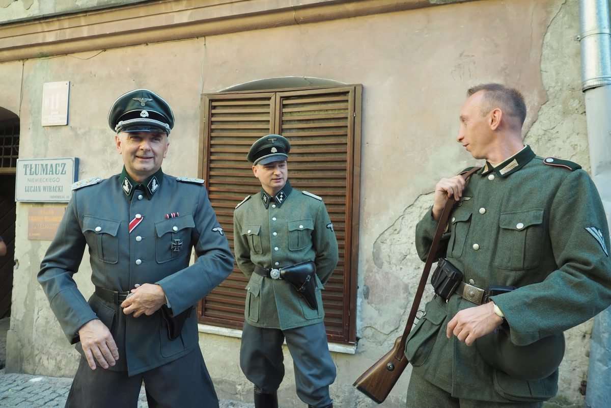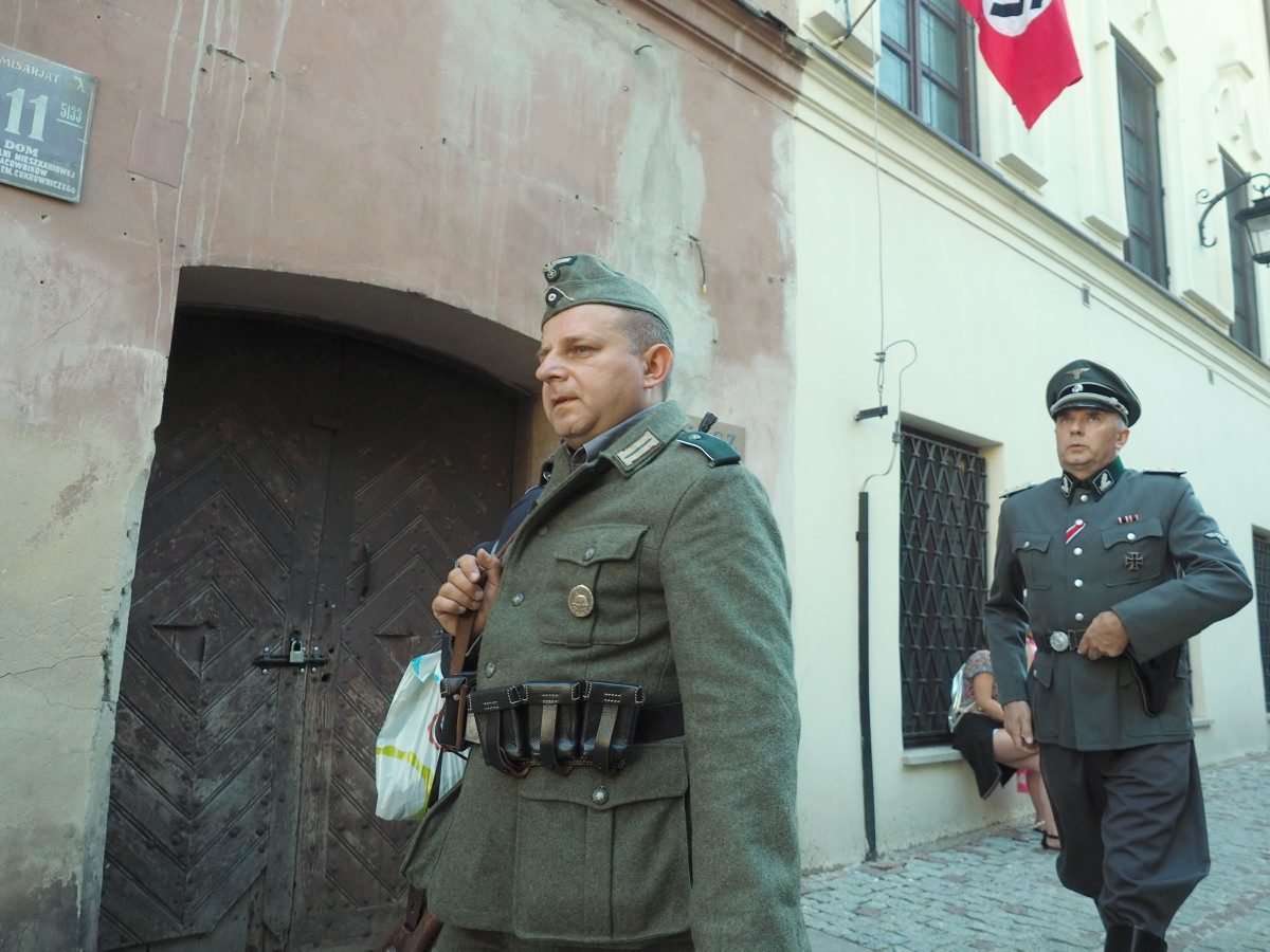 Filmowcy upodobali sobie lubelskie Stare Miasto, gdzie powstaje najwięcej zdjęć. Nad ul. Jezuicką zawisły wielkie flagi ze swastykami, a po ulicy kręcili się statyści w niemieckich mundurach z czasów hitlerowskich. Fot. Maciej Kaczanowski