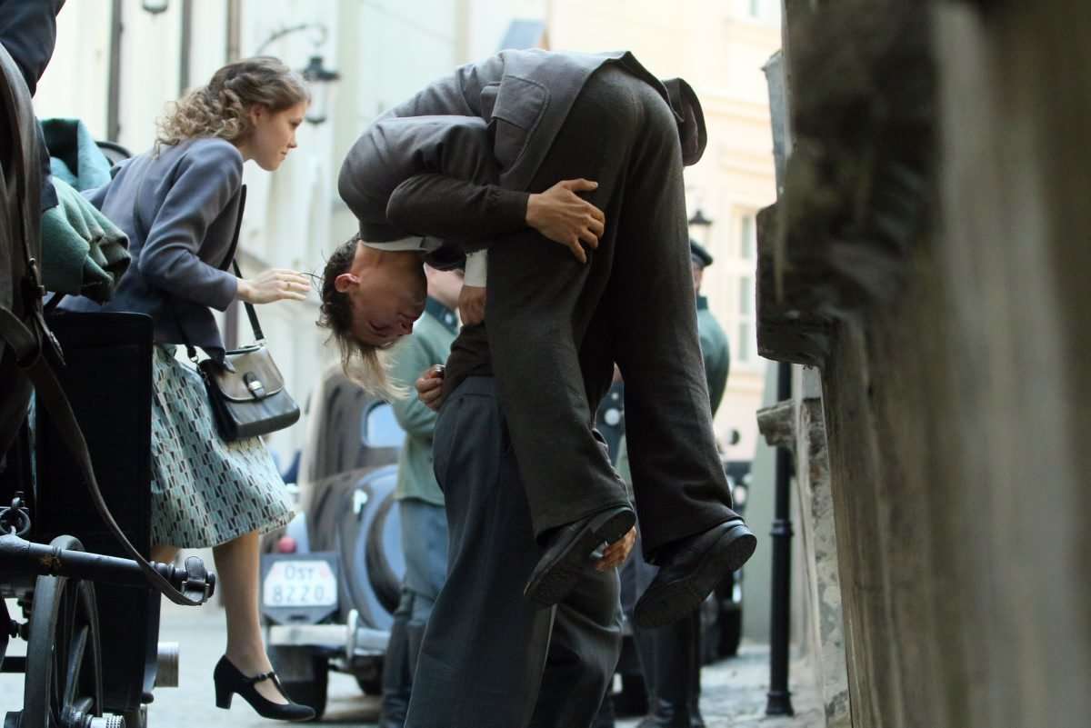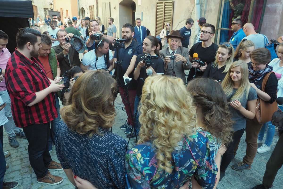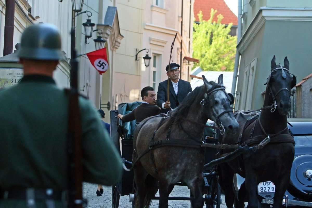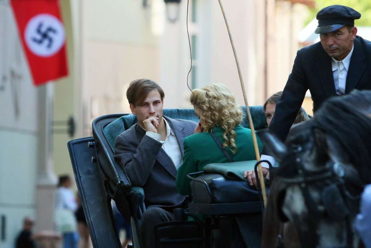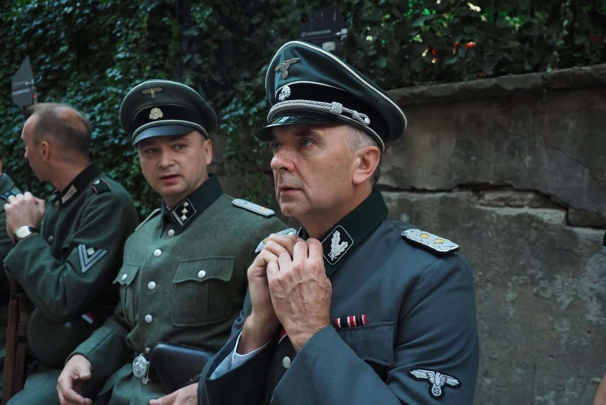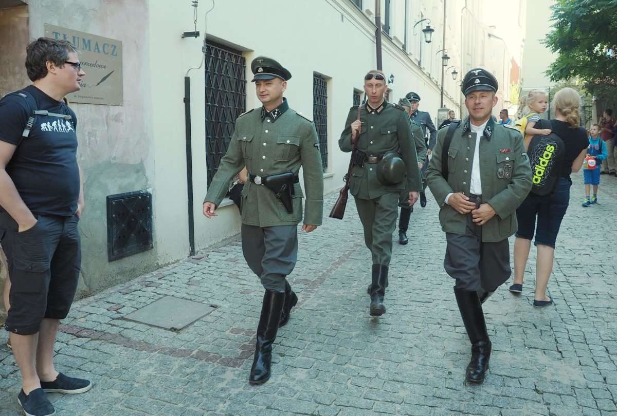 Filmowcy upodobali sobie lubelskie Stare Miasto, gdzie powstaje najwięcej zdjęć. Nad ul. Jezuicką zawisły wielkie flagi ze swastykami, a po ulicy kręcili się statyści w niemieckich mundurach z czasów hitlerowskich. Fot. Maciej Kaczanowski
