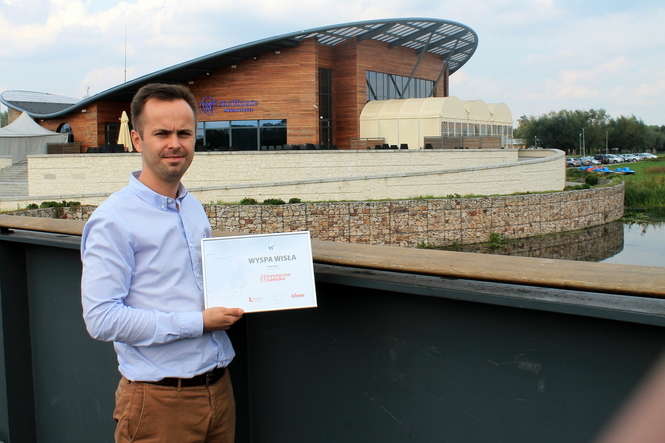Wyspa Wisła zwyciężyła w naszym plebiscycie pokonując konkurentów z całego województwa. Na zdjęciu menedżer obiektu, Hubert Filipek z pamiątkowym dyplomem
