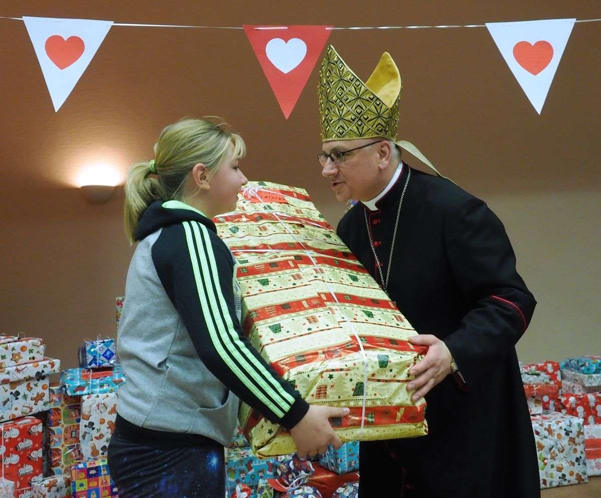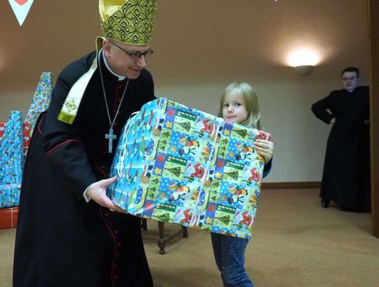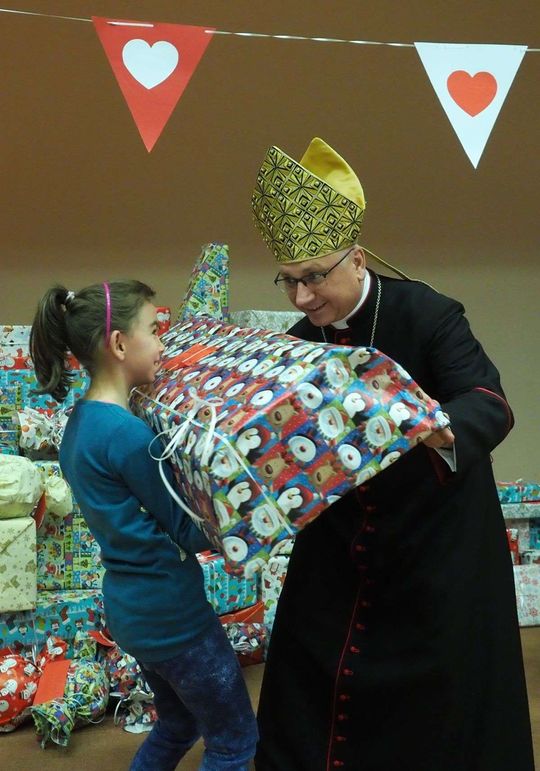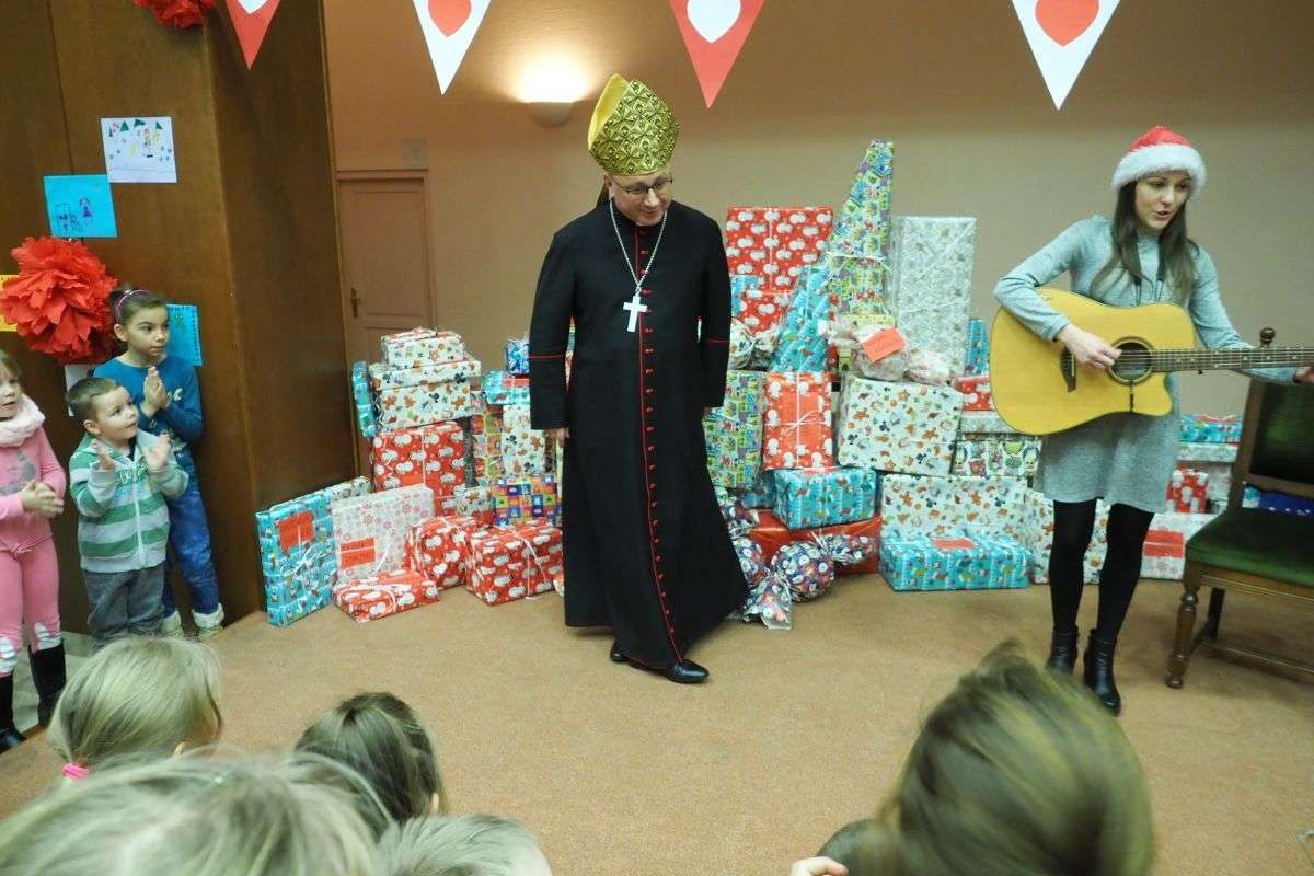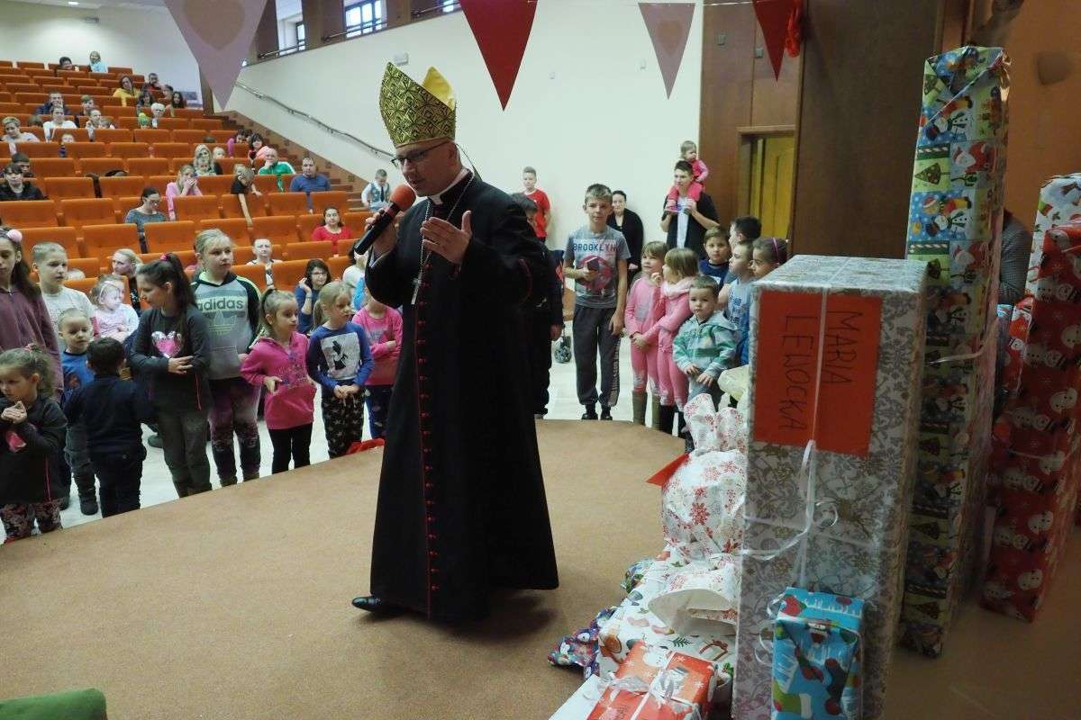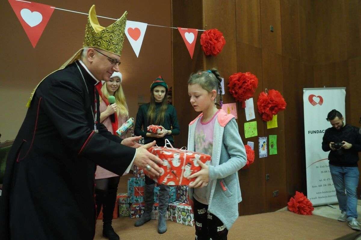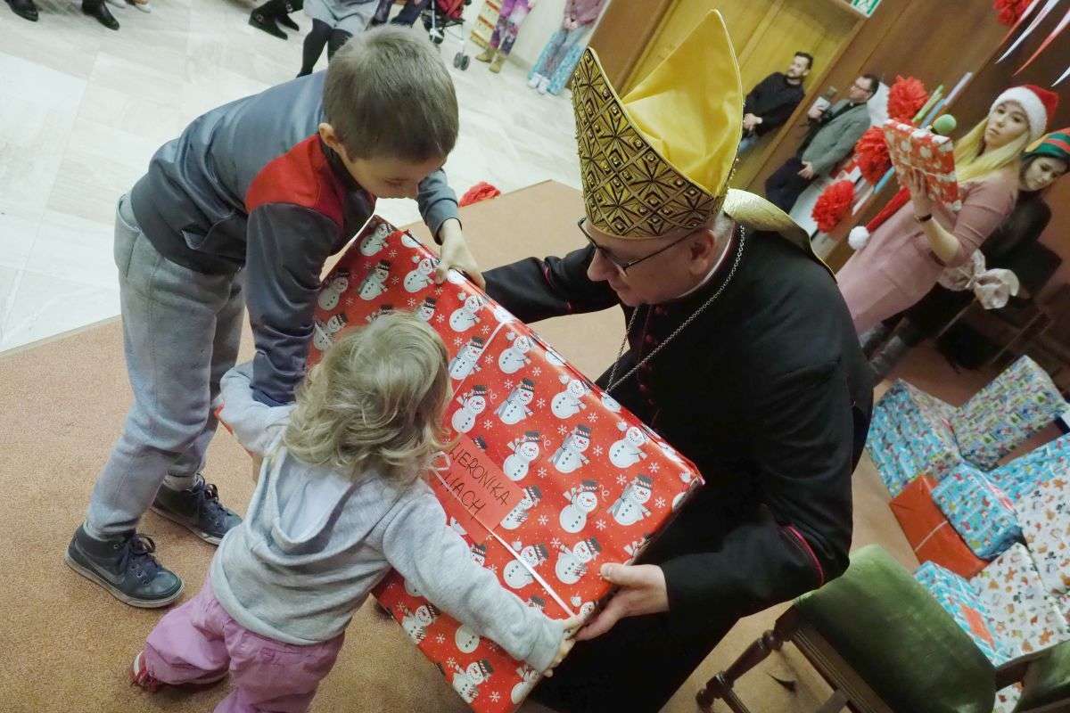 Prezenty z Nieba w Caritas Archidiecezji Lubelskiej. Wsparcie wielu życzliwych osób pozwoliło spełnić marzenia ponad setki dzieciaków z potrzebujących rodzin. W rolę Świętego Mikołaja wcielił się prawdziwy biskup – sekretarz KEP ks. Artur Miziński. Fot. Maciej Kaczanowski