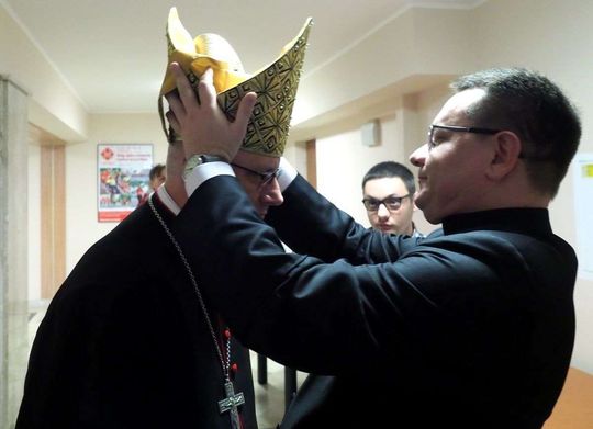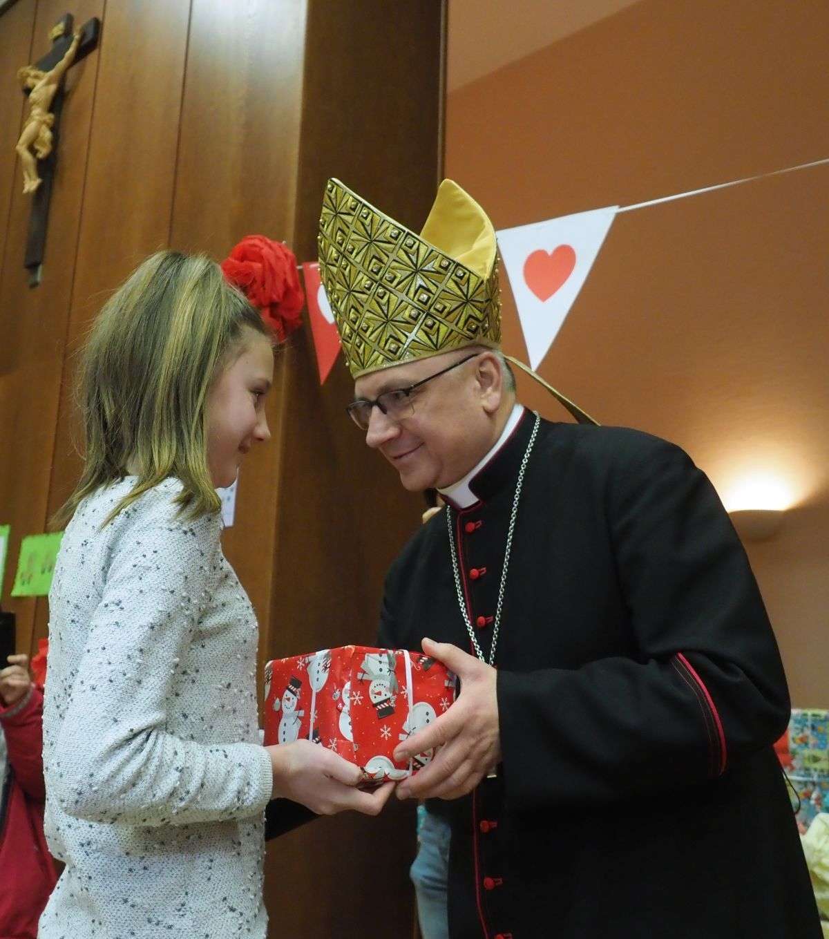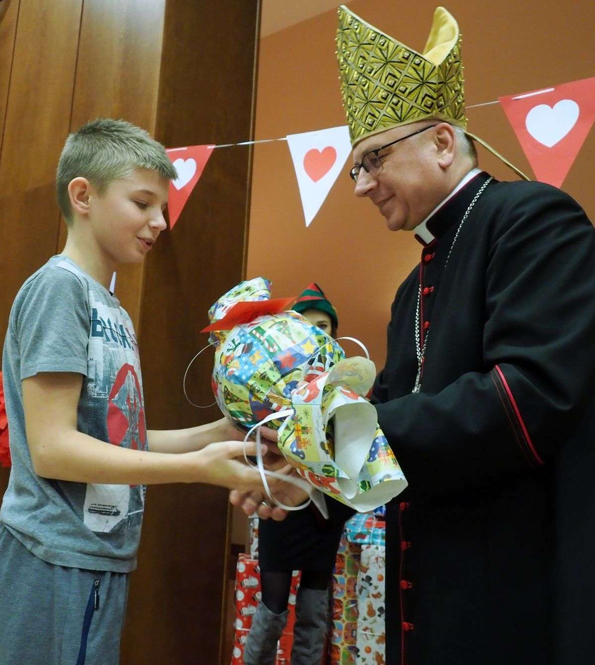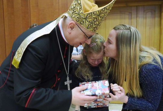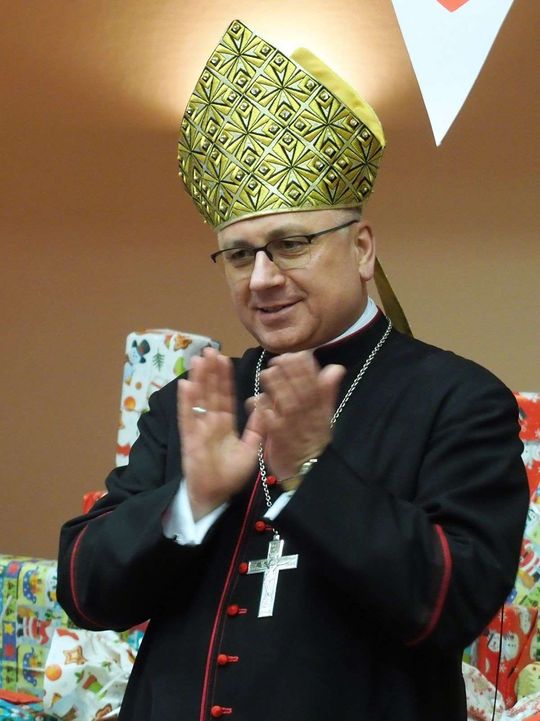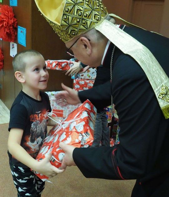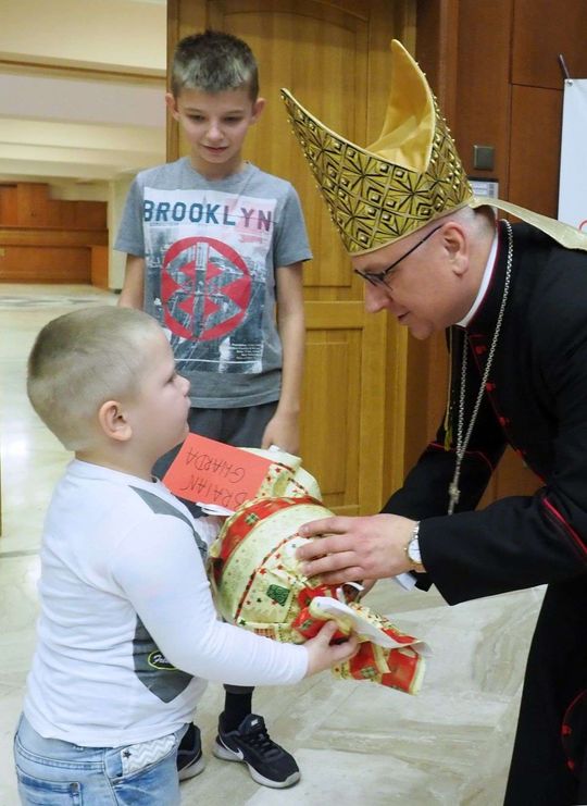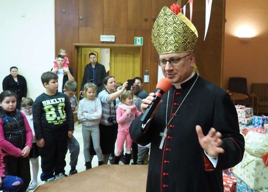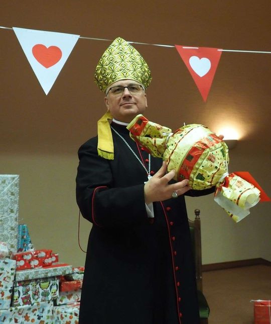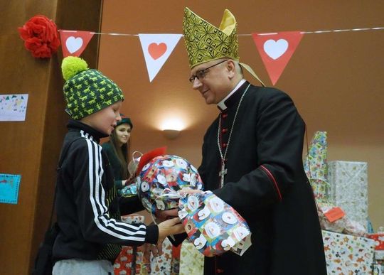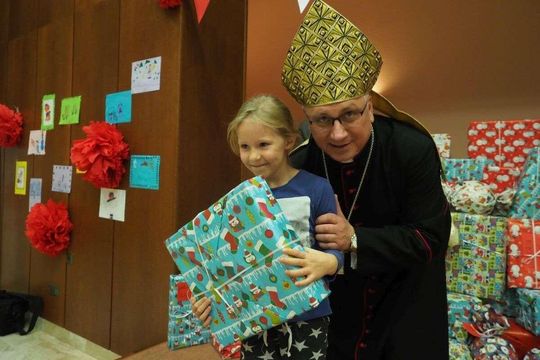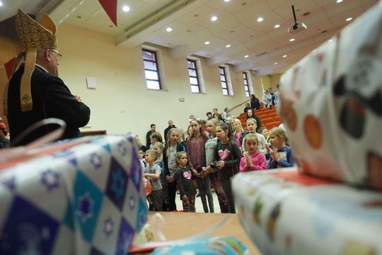 Prezenty z Nieba w Caritas Archidiecezji Lubelskiej. Wsparcie wielu życzliwych osób pozwoliło spełnić marzenia ponad setki dzieciaków z potrzebujących rodzin. W rolę Świętego Mikołaja wcielił się prawdziwy biskup – sekretarz KEP ks. Artur Miziński. Fot. Maciej Kaczanowski