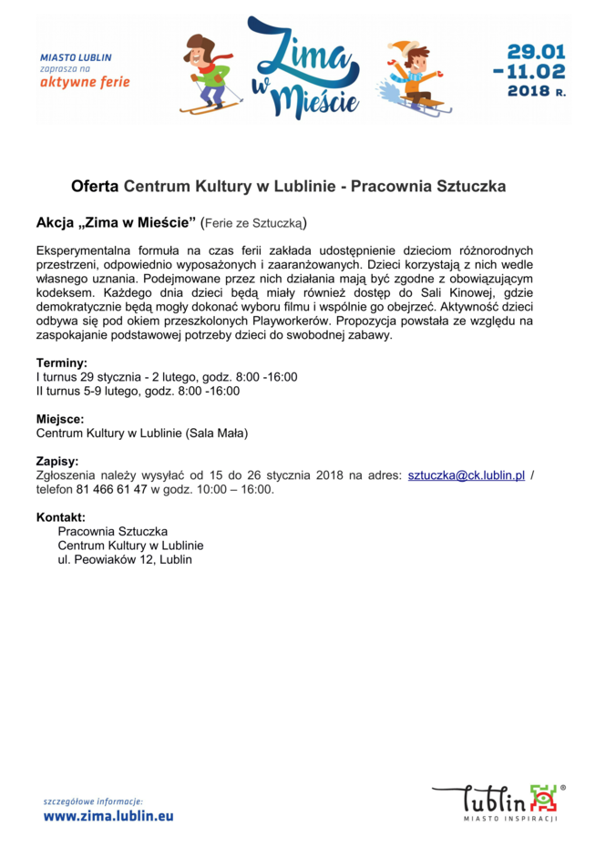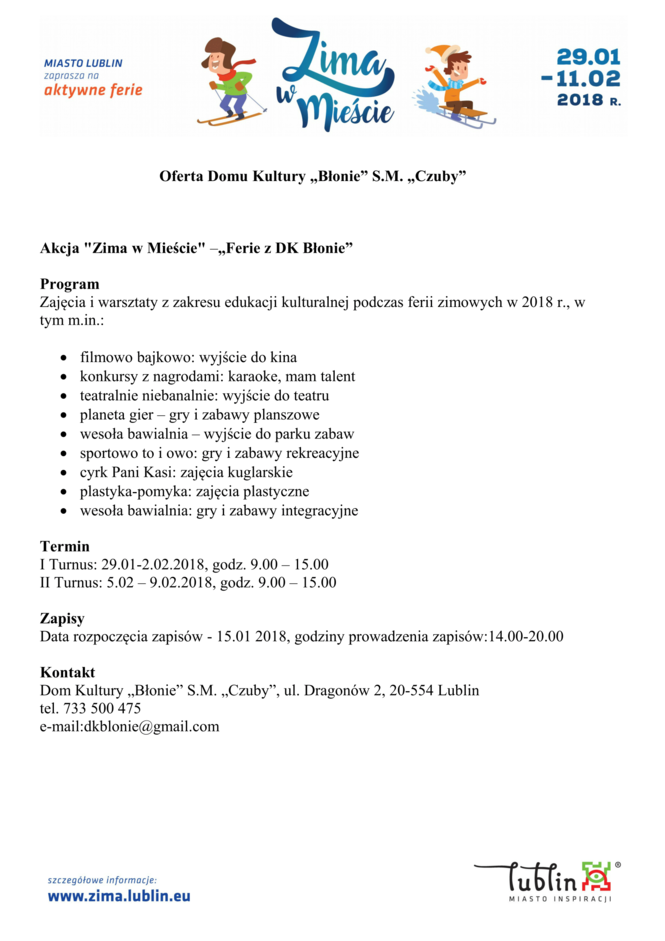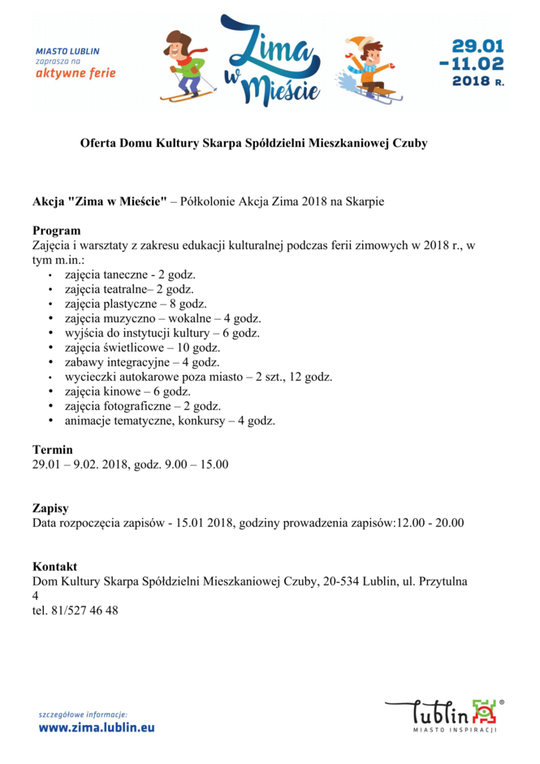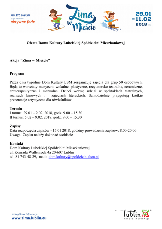Ferie 2018 w Lublinie. Zima w mieście - baseny, lodowiska, domy kultury