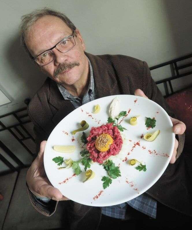 Polędwicę na tatara wybiera osobiście. Po swojemu oczyszcza mięso. Sieka, miesza, doprawia szukając idealnego smaku. Tatar z polędwicy wołowej podawany jest z cebulą, pomidorem, suszonym borowikami, pieczarkami, kaparami, i ogórkiem konserwowym. Naszym zdaniem, najbardziej przypomina w smaku mistrzowskie tatary podawane przez mistrzów lubelskiej kuchni w latach 1960-1981.
