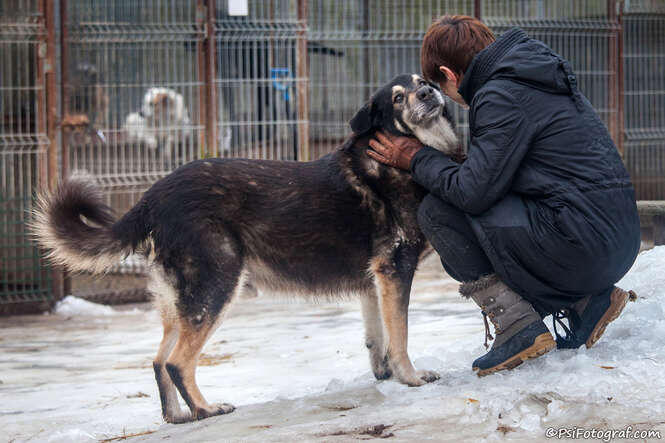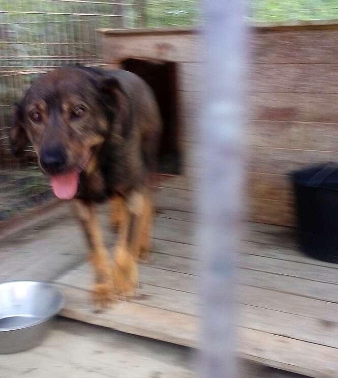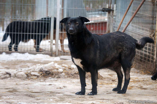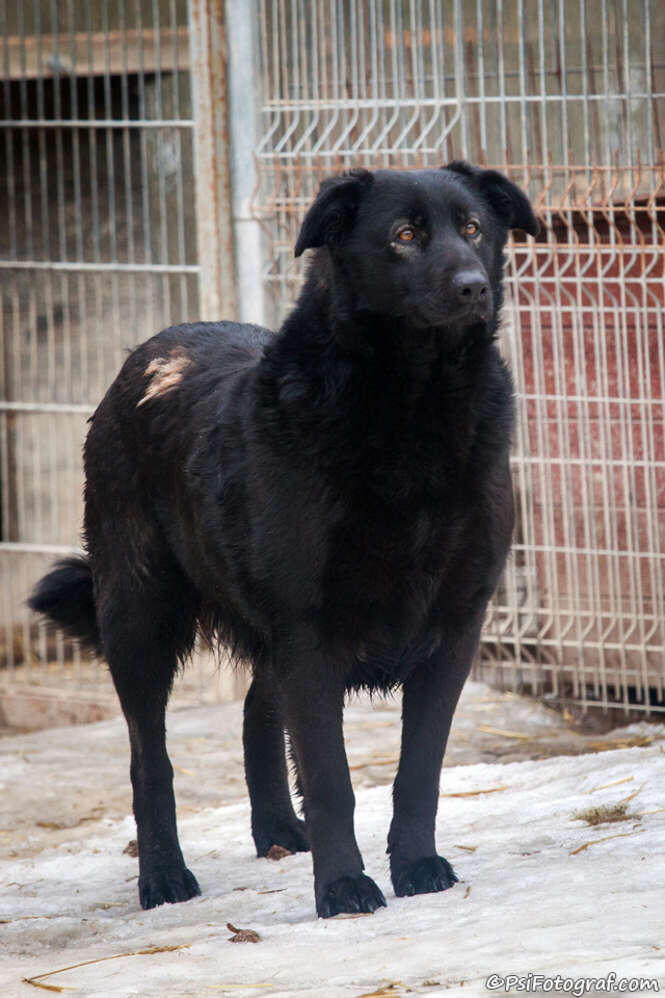 Gufi jest dużym psiakiem w wieku około 4 lat. Do schroniska trafił we wrześniu 2014 roku z Gminy Jabłonna. Jest psem wysokim, szczupłym i krótkowłosym o grafitowym ubarwieniu. Jest wykastrowany. Gufi do niedawna był psiakiem nieufnym, unikającym kontaktu z człowiekiem. Zapewne wynikało to z jego przedschroniskowych przykrych doświadczeń z ludźmi. Na szczęście się zmienił. To teraz bardzo aktywny, wesoly i przyjazny psiak. Nie wykazuje agresji ani wobec ludzi, ani innych psów. Przebywa w boksie z dwoma niewielkimi suczkami. Na wybiegu Gufi jest cały czas w ruchu, musi gdzieś wyładować nagromadzona energię. Sprawdza wszystkie kąty, zaczepia pracowników i swoje koleżanki z boksu, skacze i próbuje zwrócic na siebie uwagę. Problem stanowi tylko założenie mu obroąy, bo na jej widok potrafi pokazywać zęby. Gufi ma duży temperament i jest silnym psem, więc nie powinien trafić do domu z małymi dziećmi. Raczej wskazany jest dla niego dom z posesją, gdzie zamieszkałby w zewnętrznym kojcu z solidną, ocieploną budą. Może trafić do domu z innym psem (suczką). Musi mieć zapewniony stały kontakt z rodzina i naprawde dużo ruchu.
