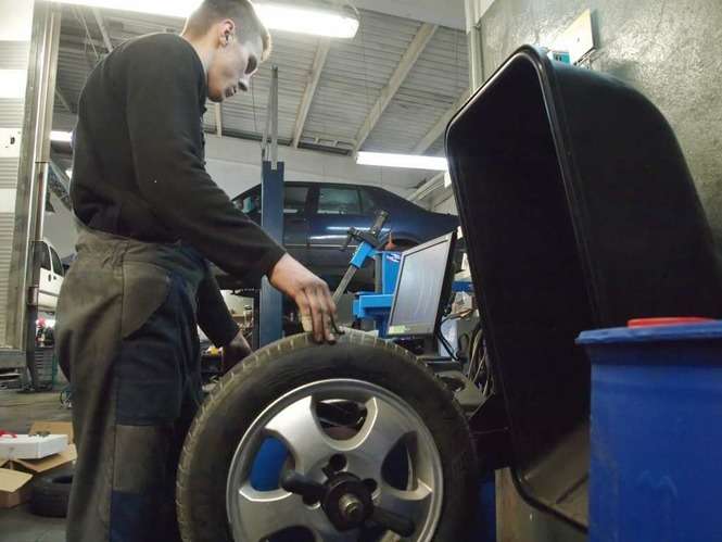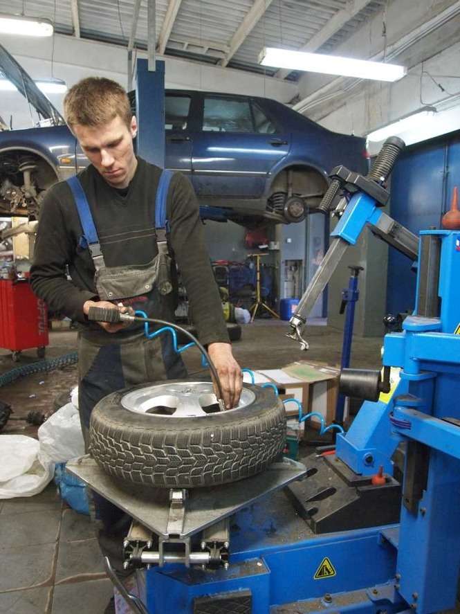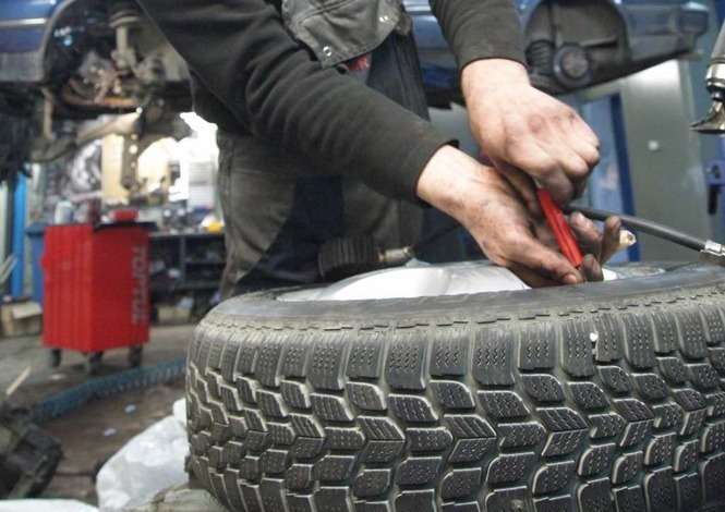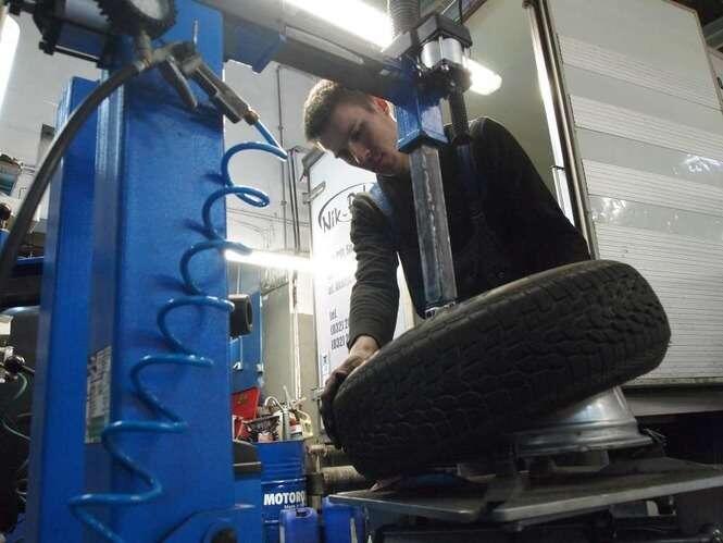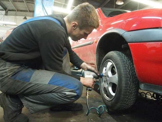 Tylko nieliczni przezorni kierowcy wcześniej pomyśleli o zmianie opon na zimowe. W związku z intensywnymi opadami śniegu mechanicy firmy Kascar mają pełne ręce roboty. Zdjęcia: Maciej Kaczanowski.