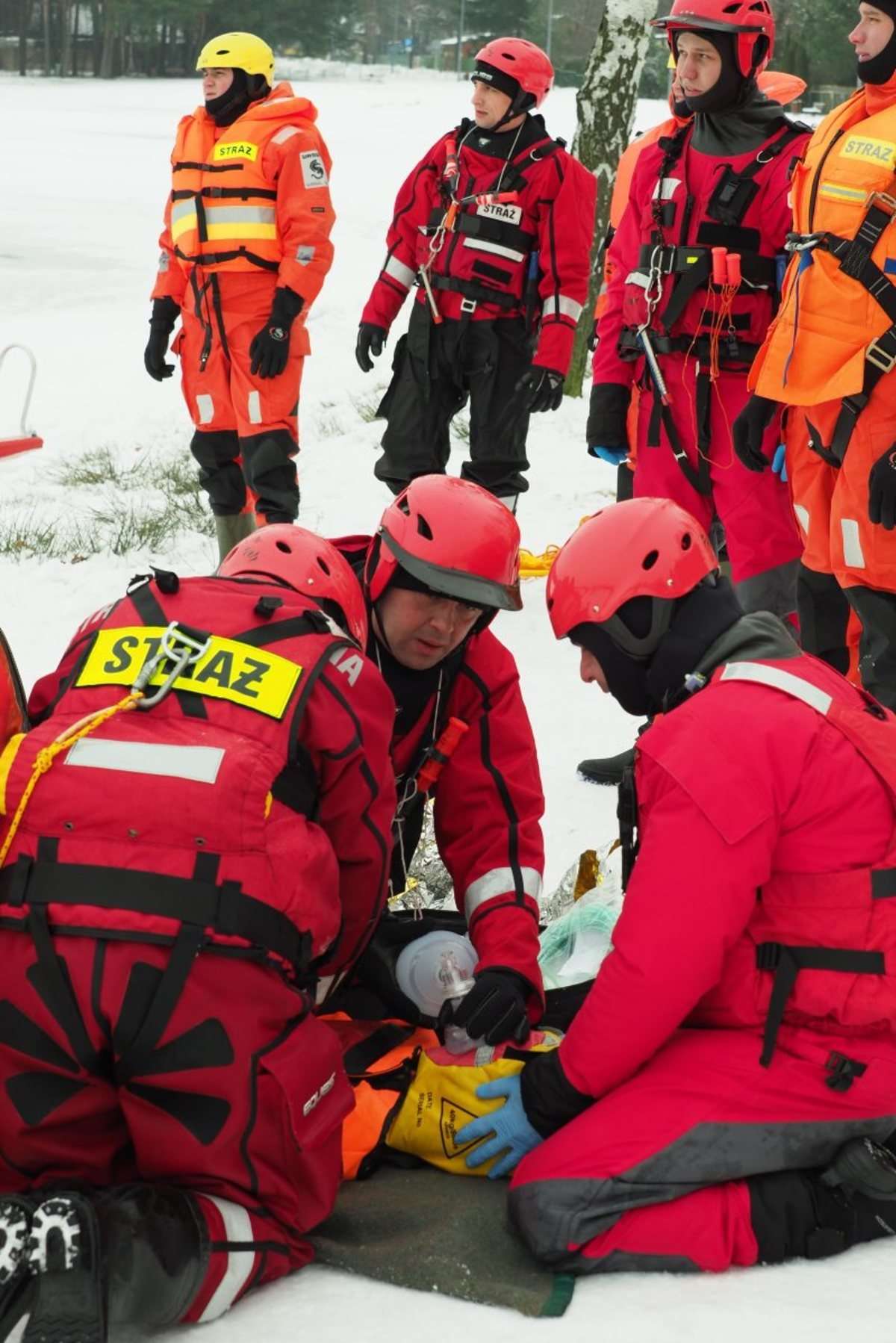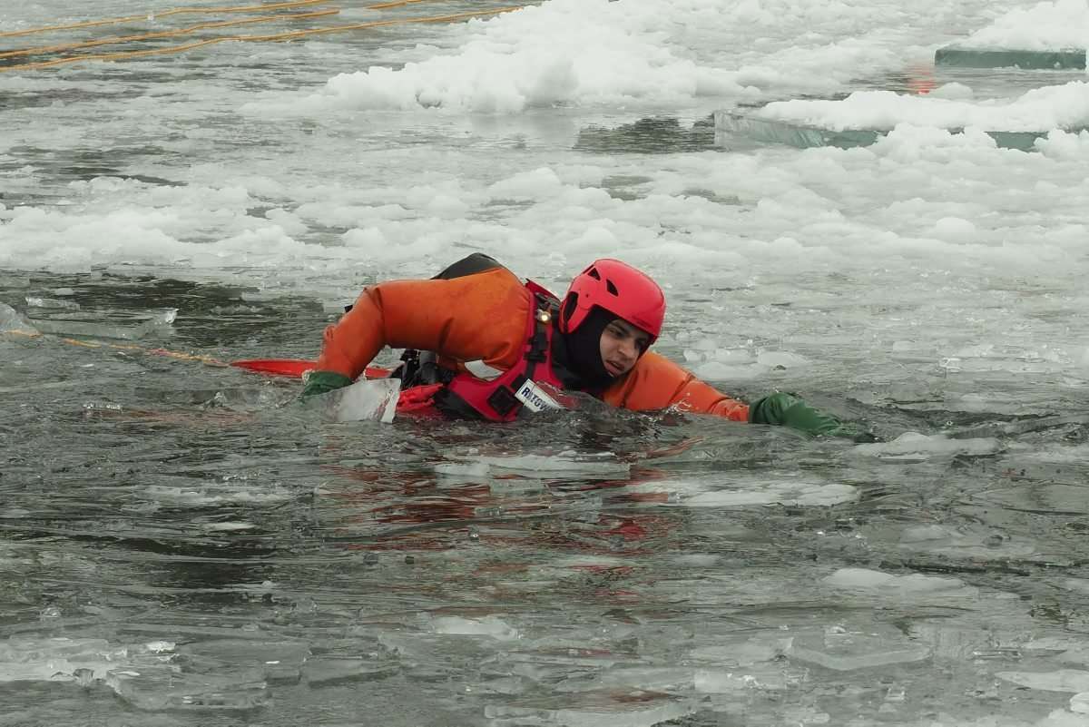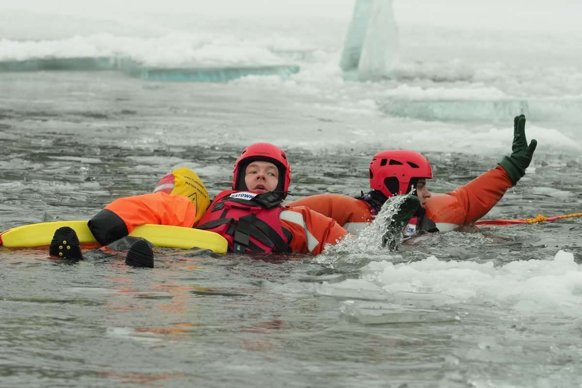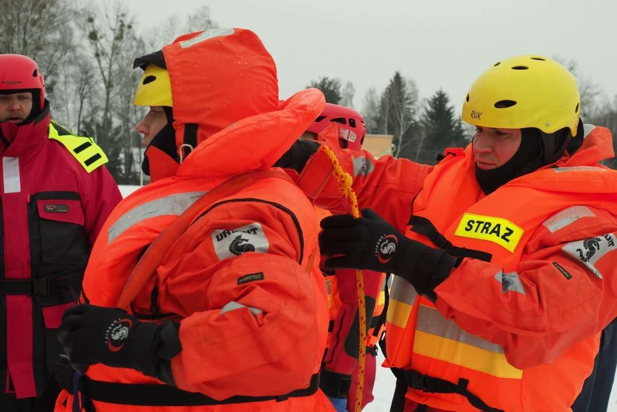 Na zamarzniętym jeziorze Białka ćwiczyli tzw. samoratowanie oraz ratowanie osób, które wpadną do lodowatej wody. Fot. Maciej Kaczanowski