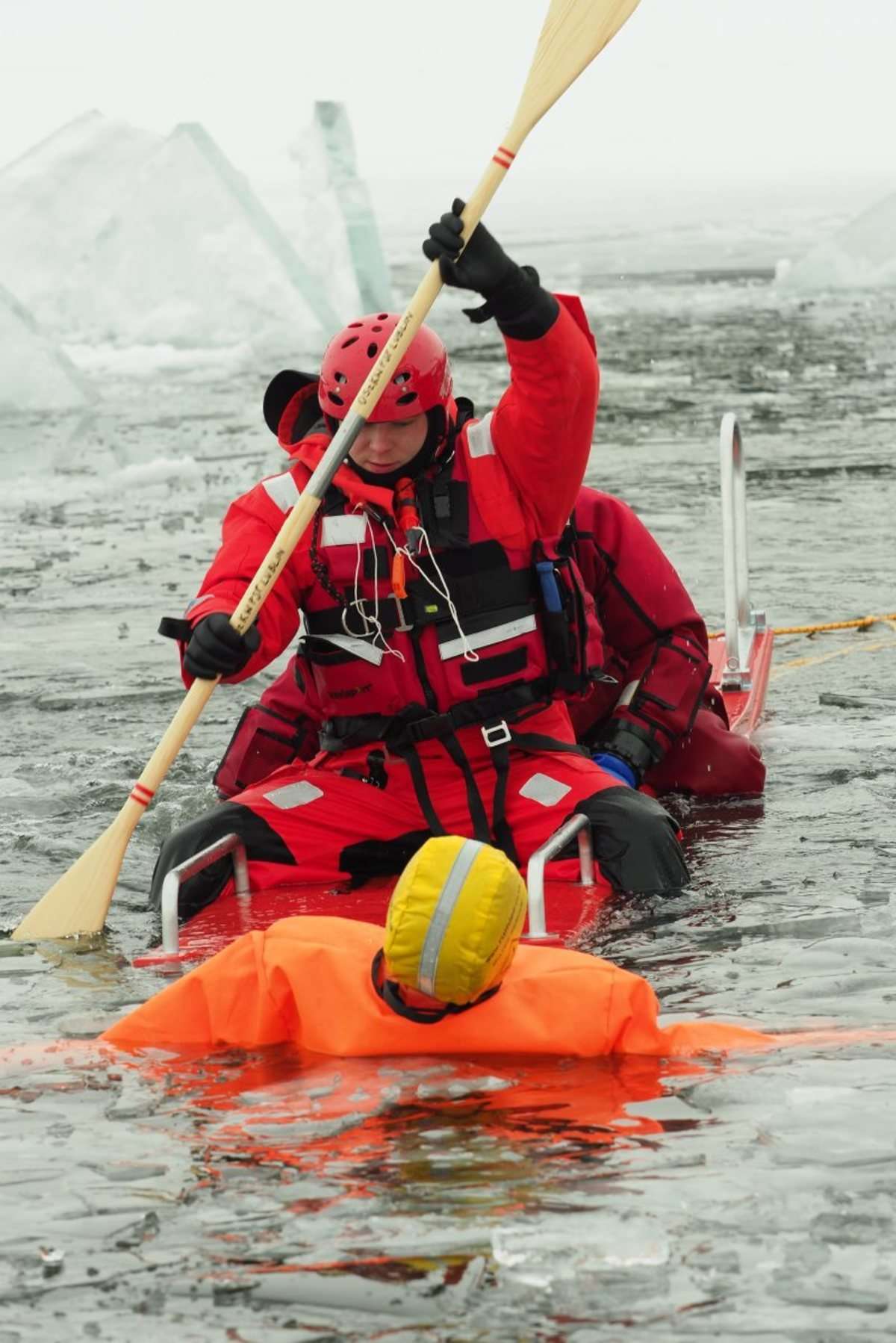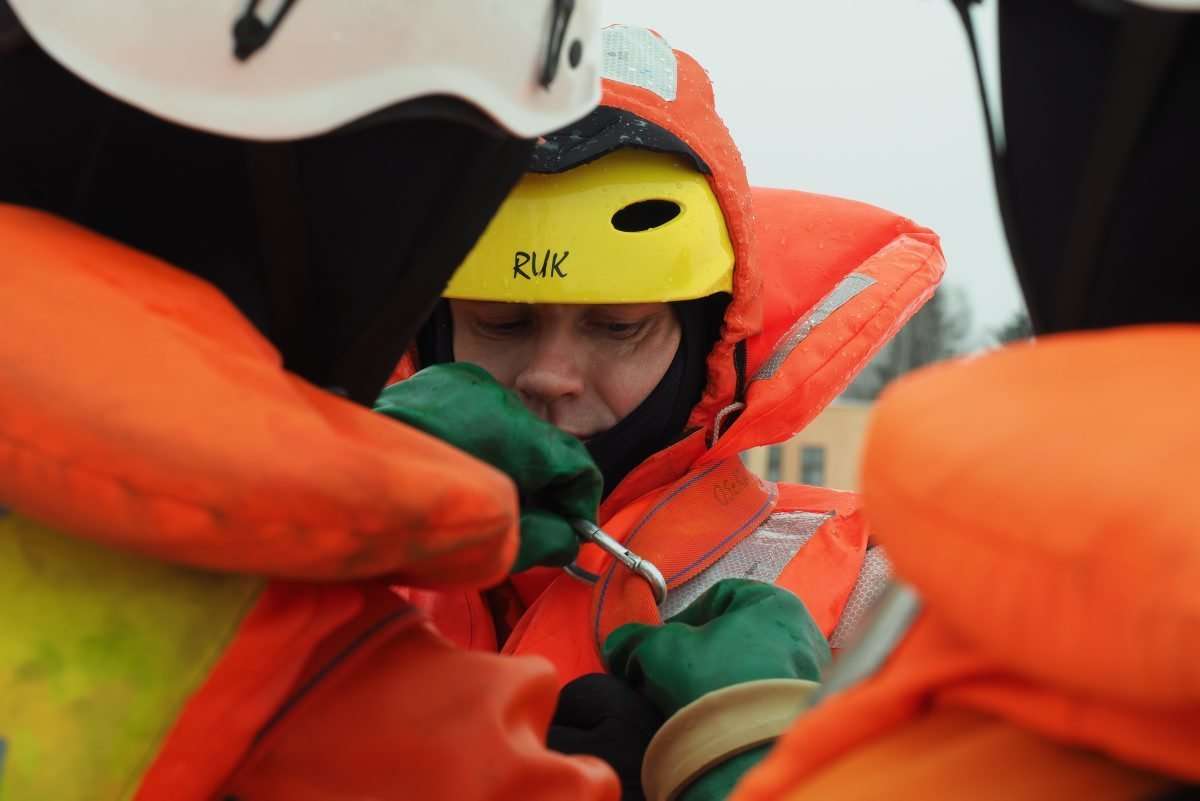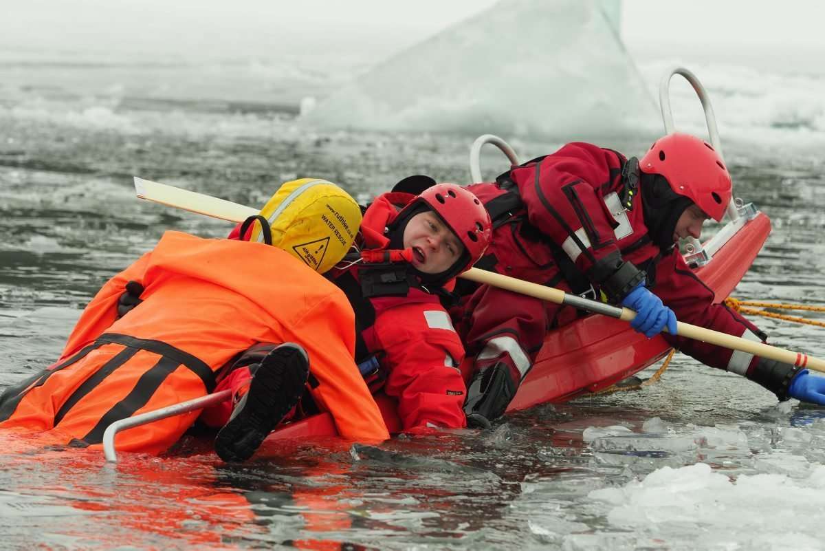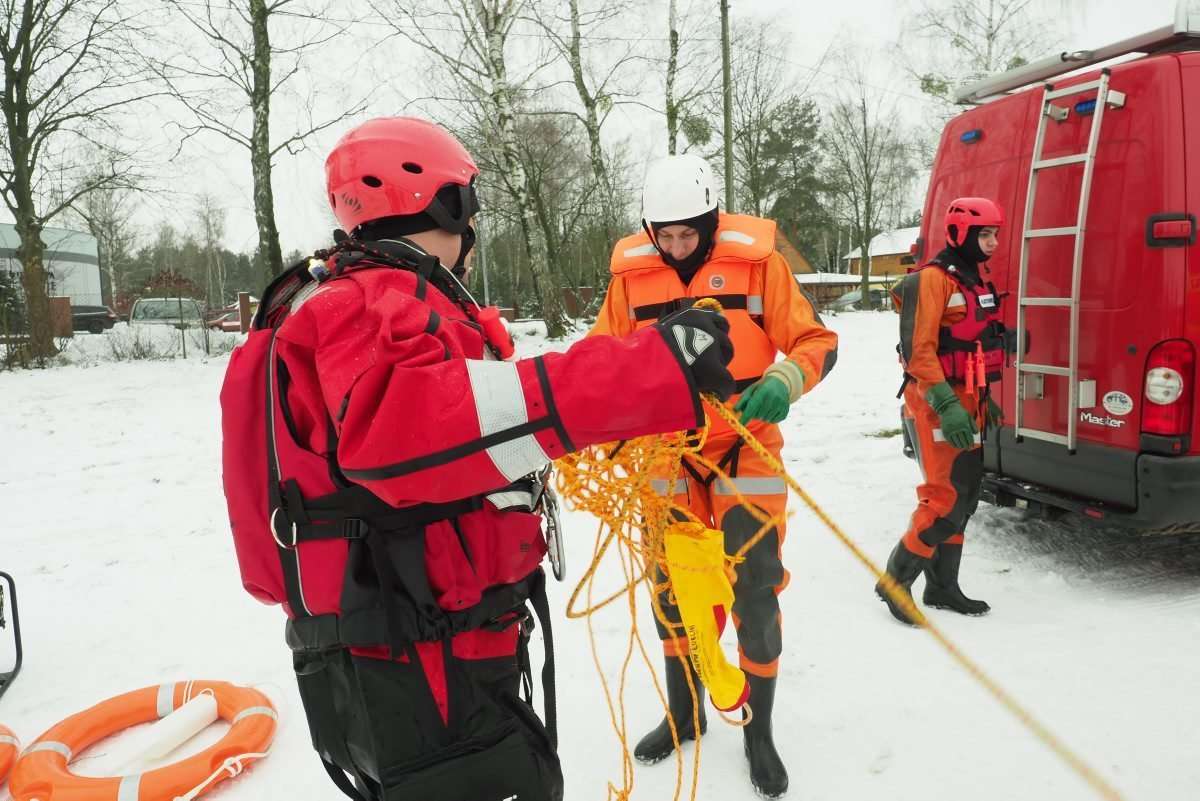 Na zamarzniętym jeziorze Białka ćwiczyli tzw. samoratowanie oraz ratowanie osób, które wpadną do lodowatej wody. Fot. Maciej Kaczanowski