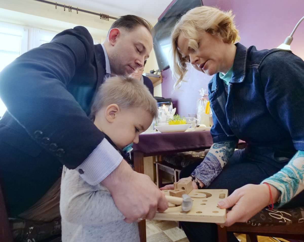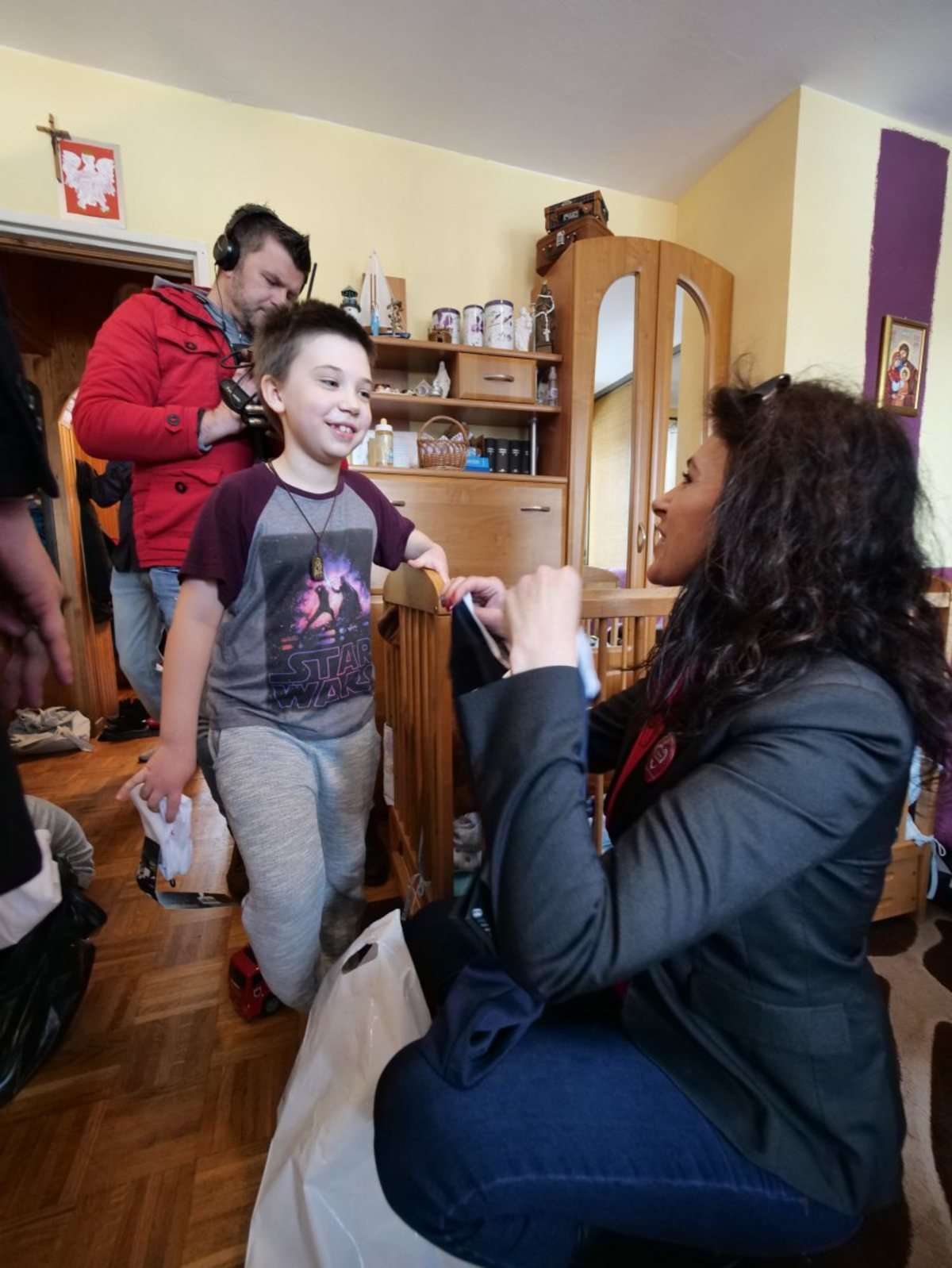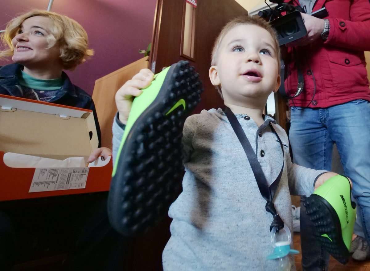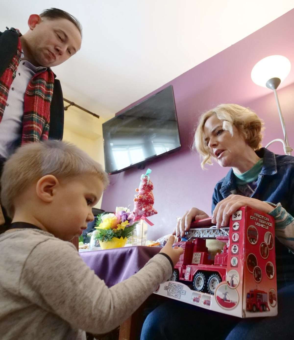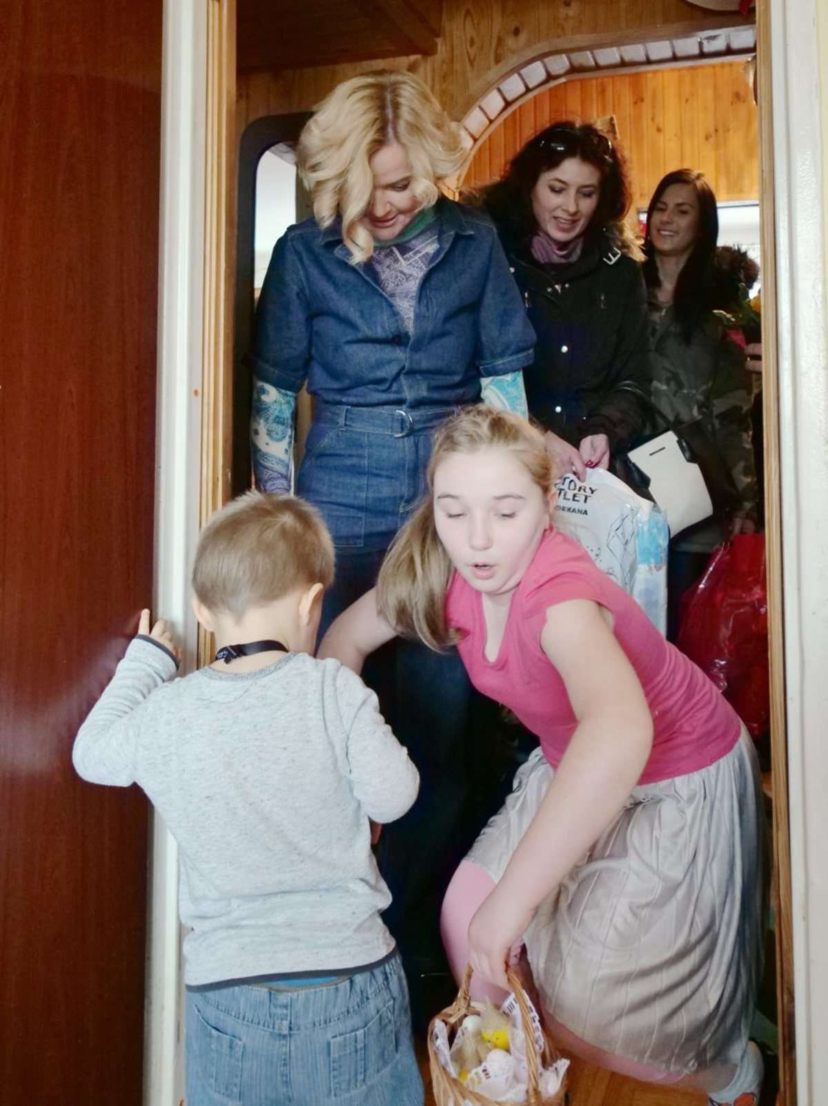 Znana dziennikarka telewizyjna Monika Zamachowska razem z przedstawicielami fundacji przekazała prezenty 9 letniej Klaudii, 6 letniemu Karolowi i Antkowi lat 2, dzieciom Joanny Trębacz z Lublina. Fot. Maciej Kaczanowski